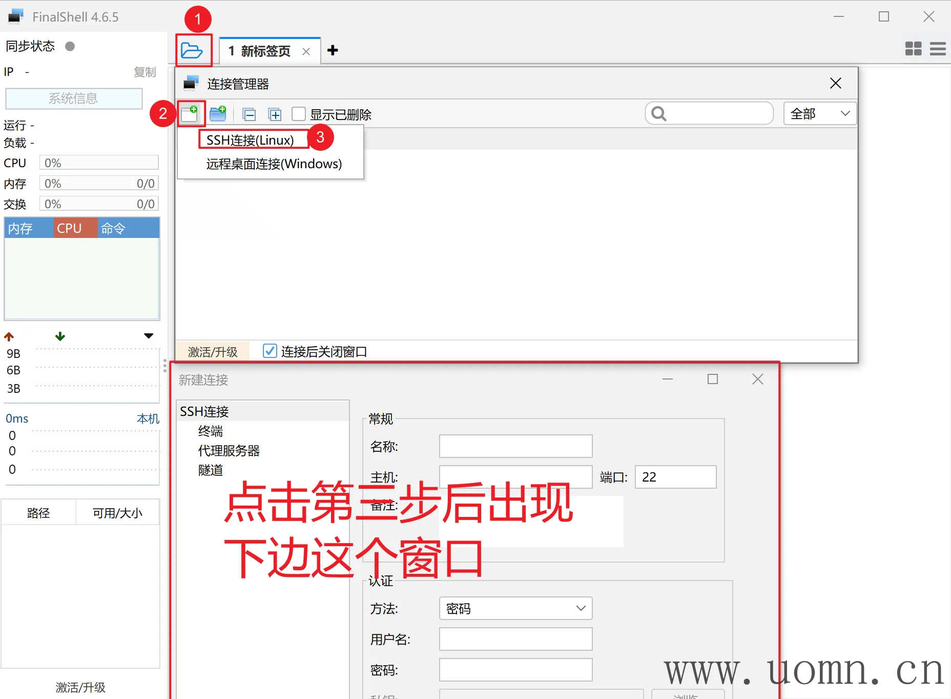 安装完成后进入工具首页准备创建SSH连接,按照图中标注顺序进行点击