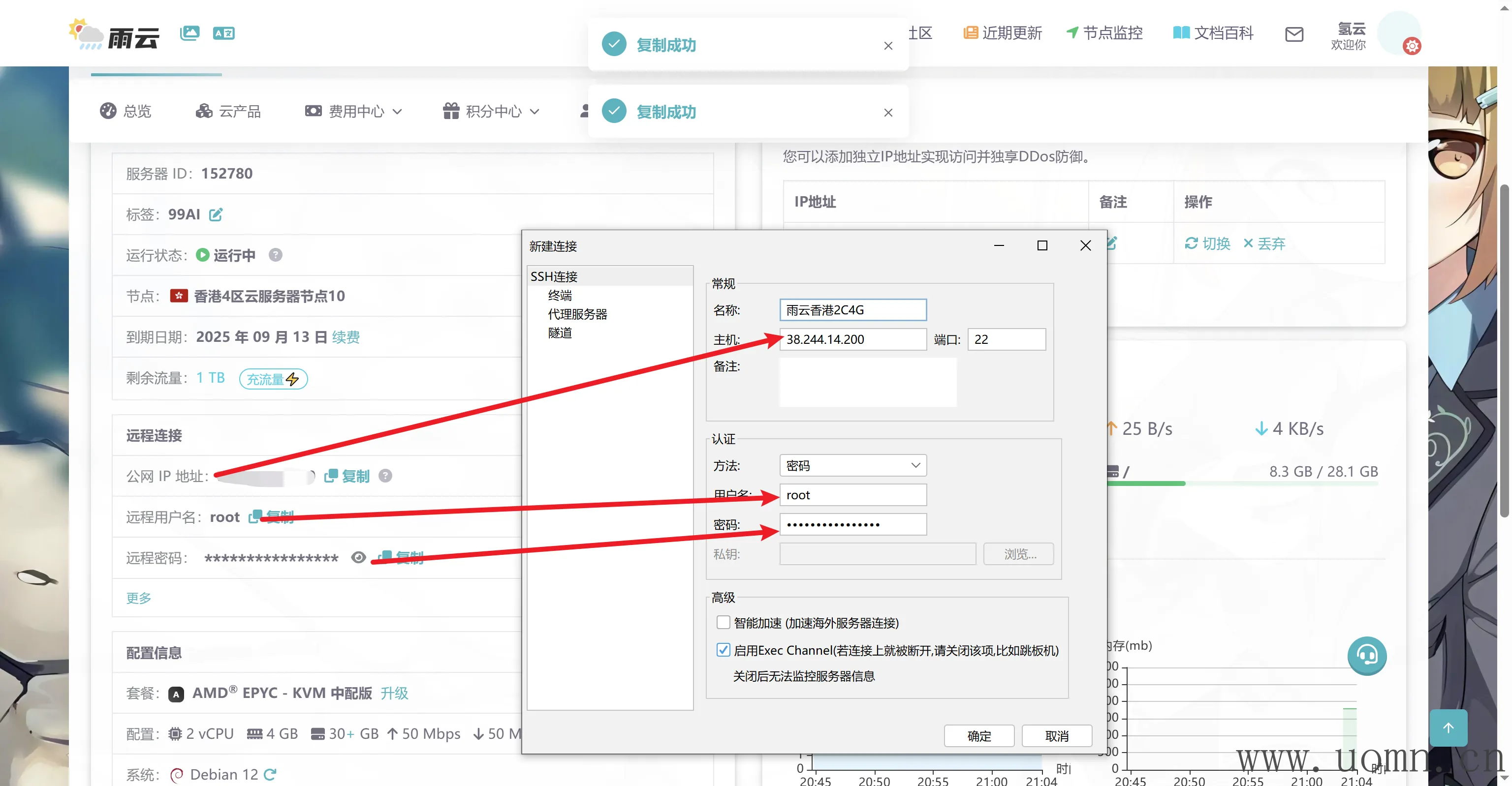 然后按照下图中指示,填好对应信息。主要是服务器IP、账号(一般是root)、密码,其中名称可以随意填写,主要用于区分多个不同云服务器。填好后点击确定