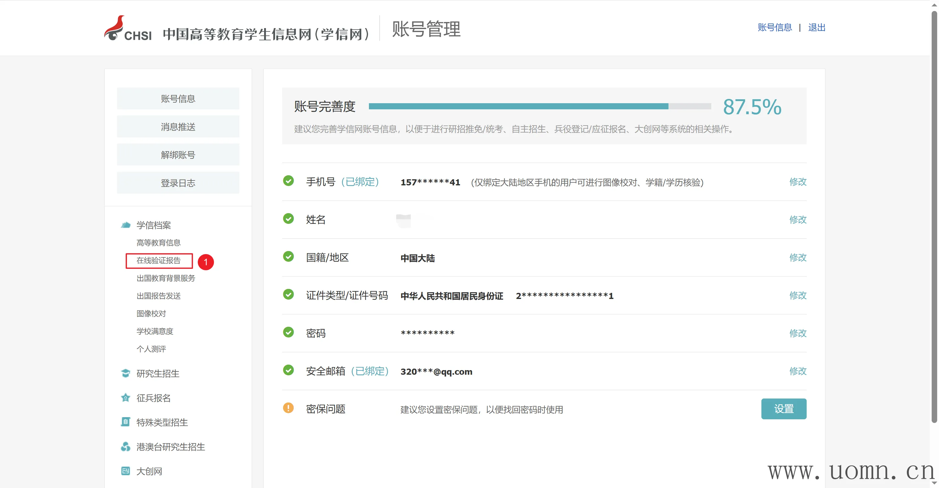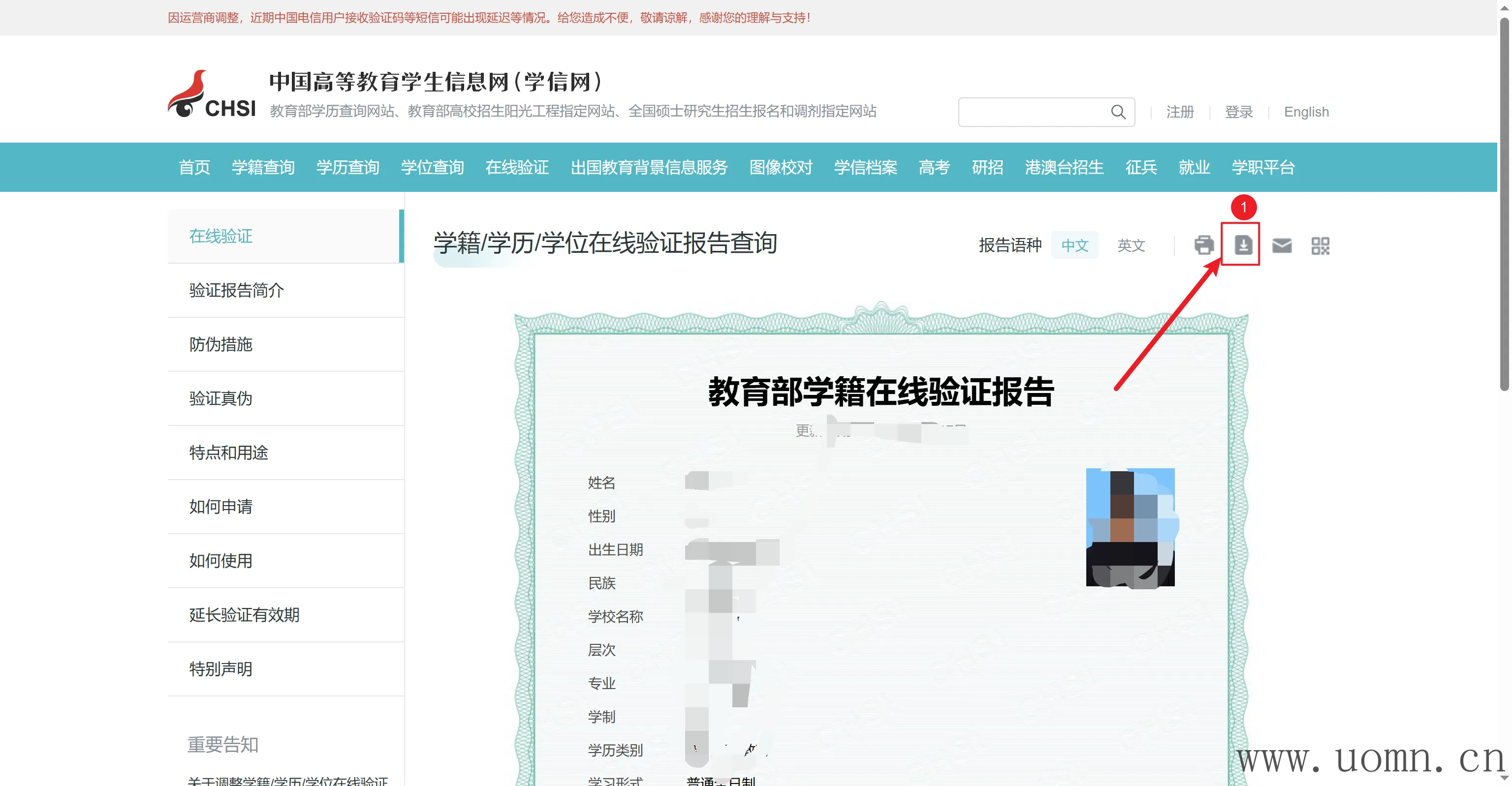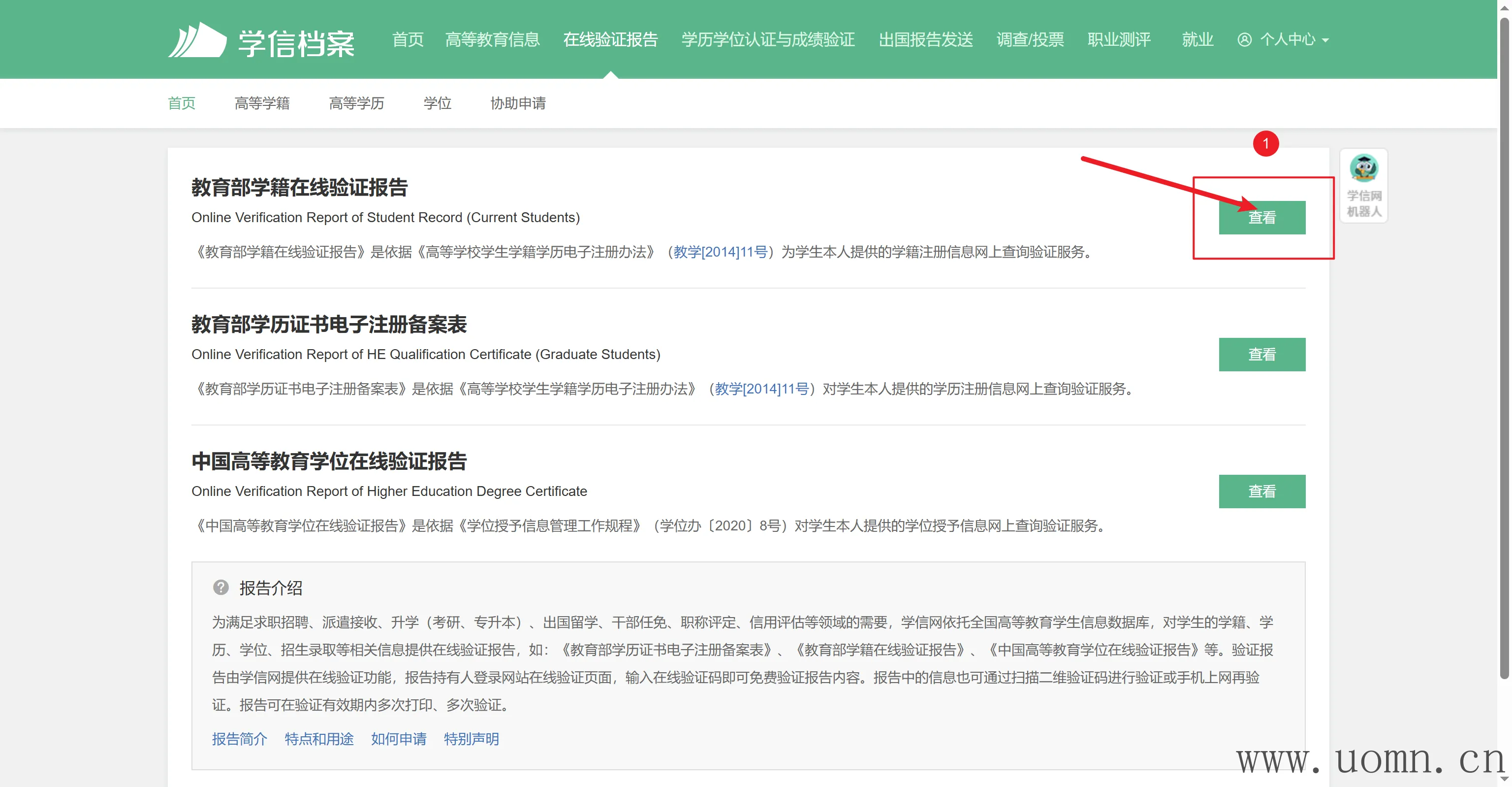 点击左侧学信档案下的在线验证报告
