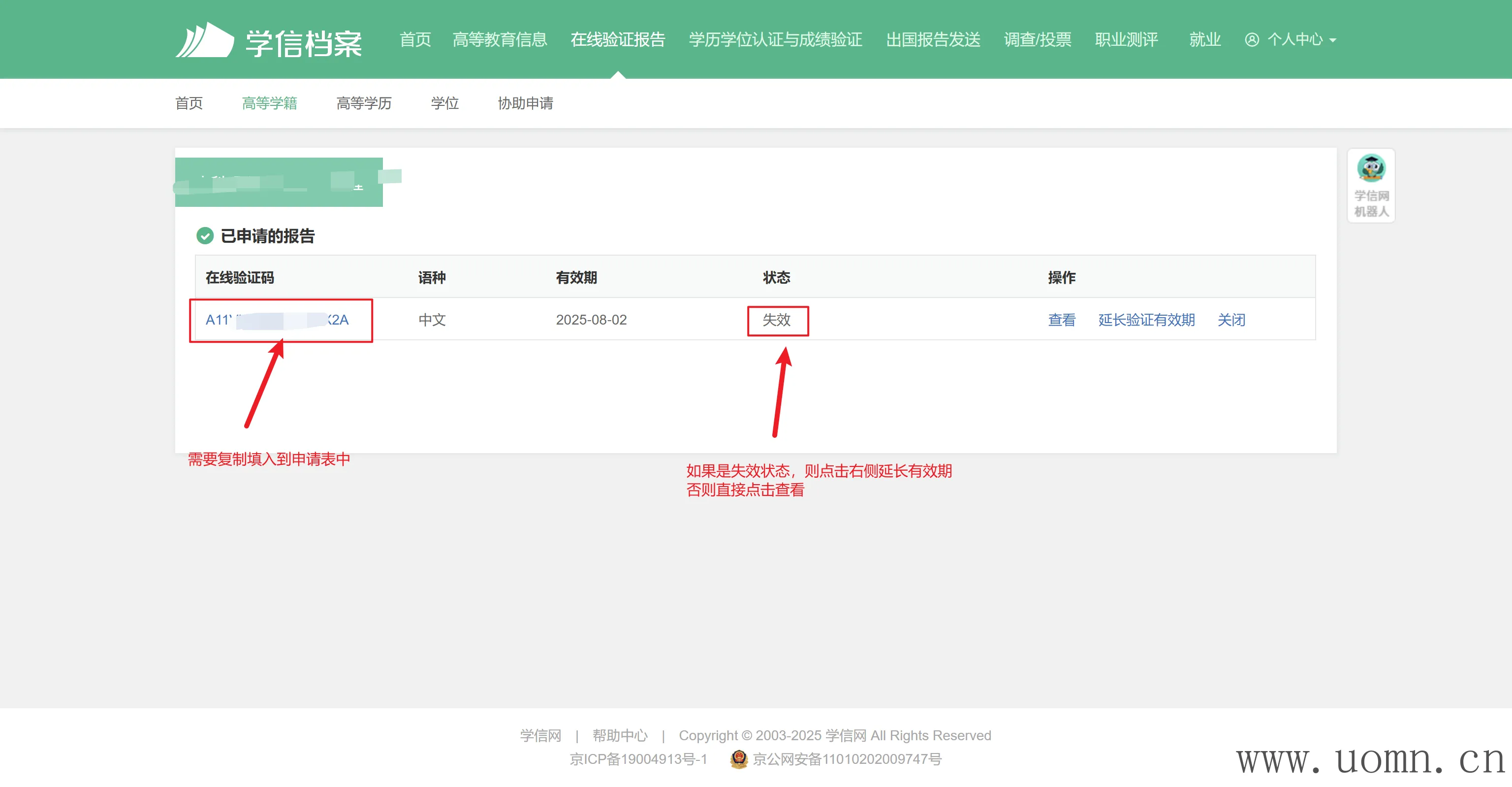 如果状态显示未失效,则点击右侧申请延长验证有效期,然后点击查看