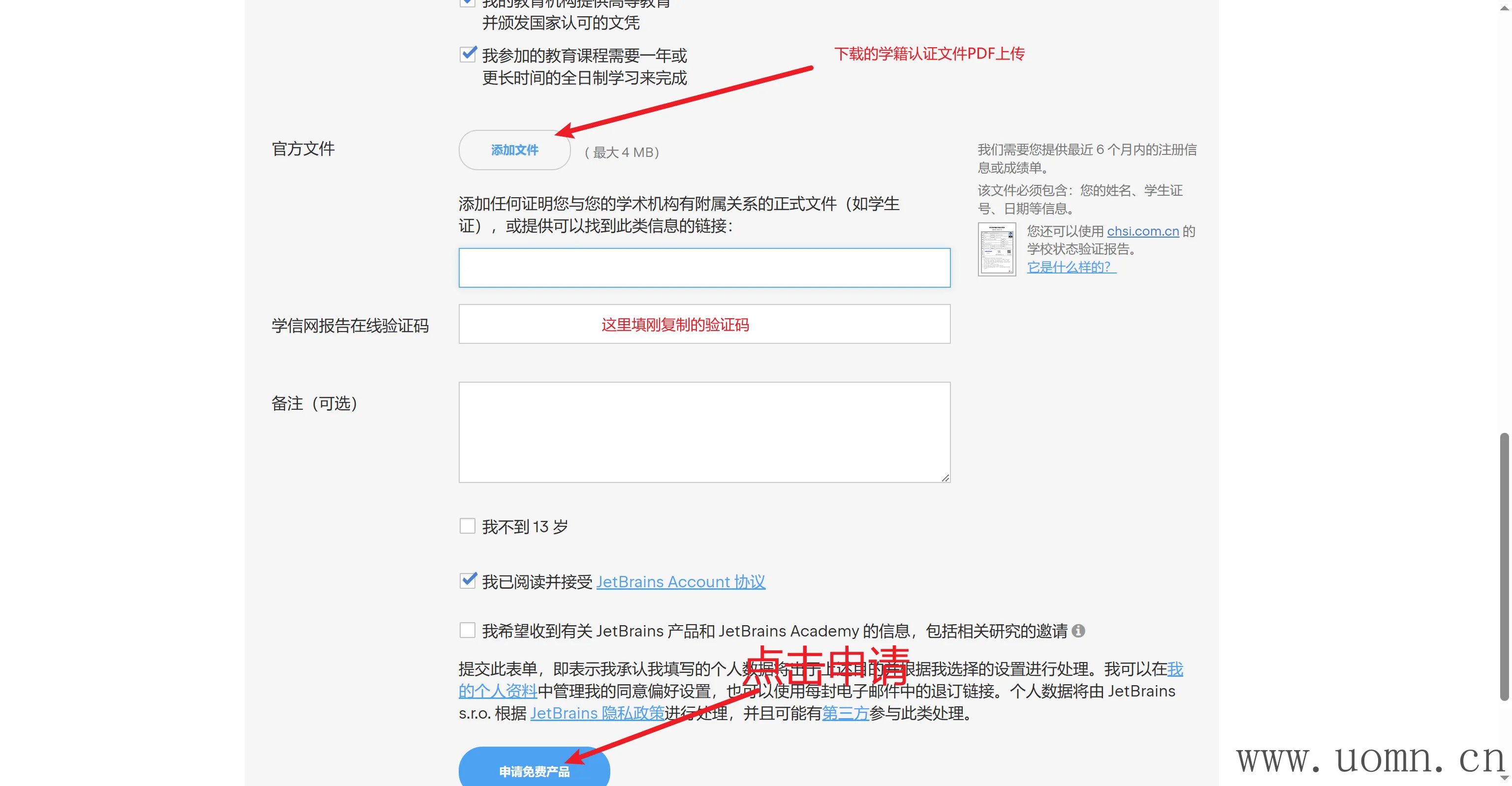 新的页面中,需要复制在线验证码,然后填入到学生认证申请表中。