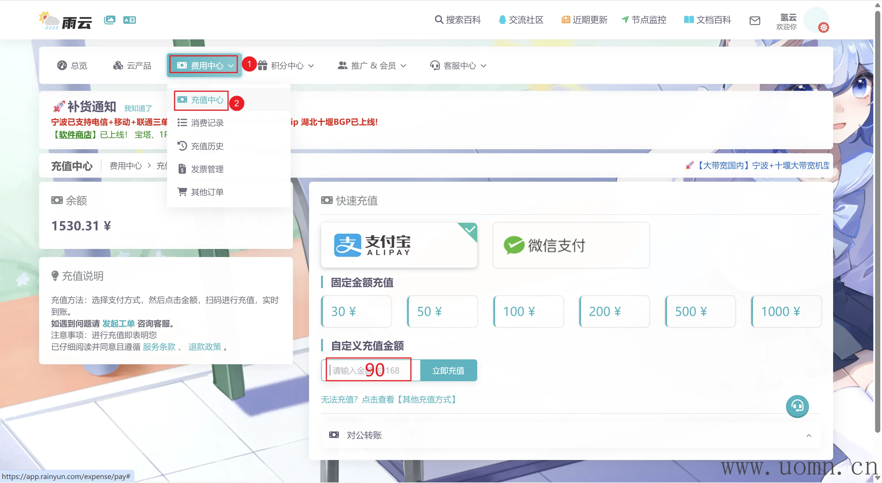 当我们想充值雨点的时候,先想好药充值多少雨点,例如:要充值100雨点,则需要90元,那么我们应当先在雨云的控制台充值90元余额,然后再用余额充值雨点