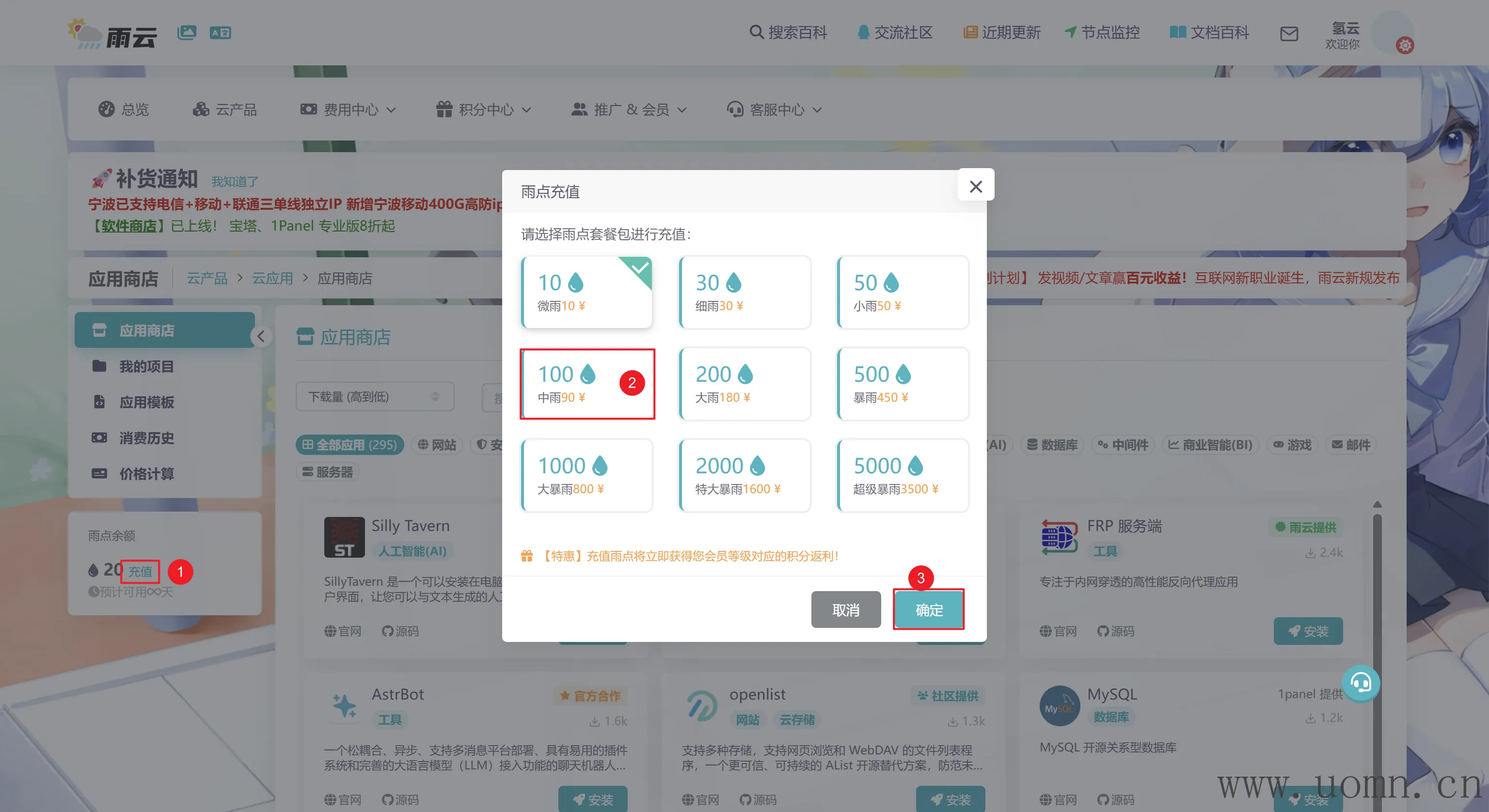 雨云的云应用现在新用户有15天免费试用以及首次充值双倍的活动