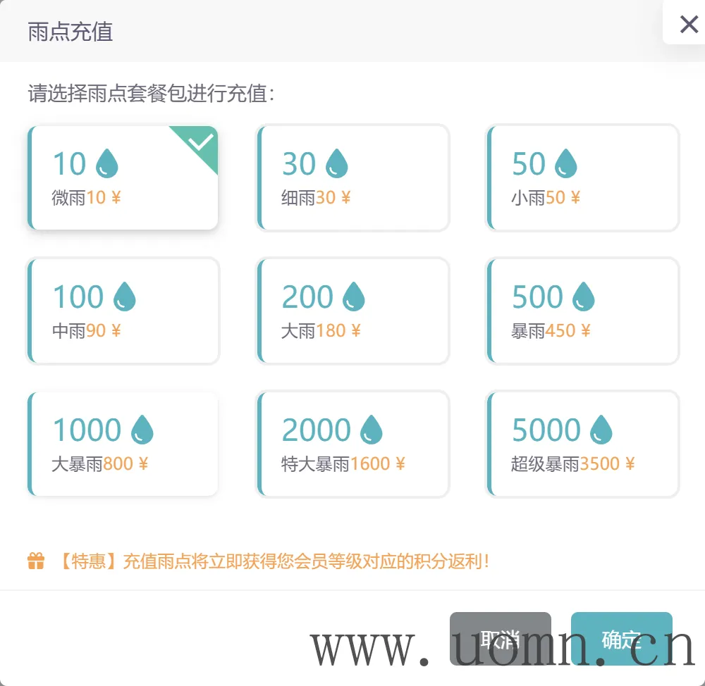 在小额充值的情况下,1元可以充值1雨点,充值的雨点越多,则单位雨点所需要充值的金额越少,如下图