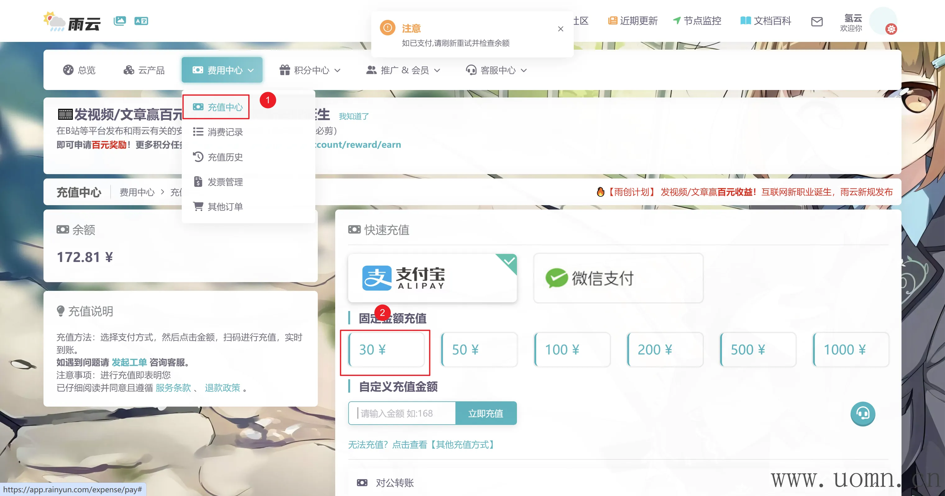 首次购买域名前,建议先去费用中心充值对应金额的余额,充值区间30-100元