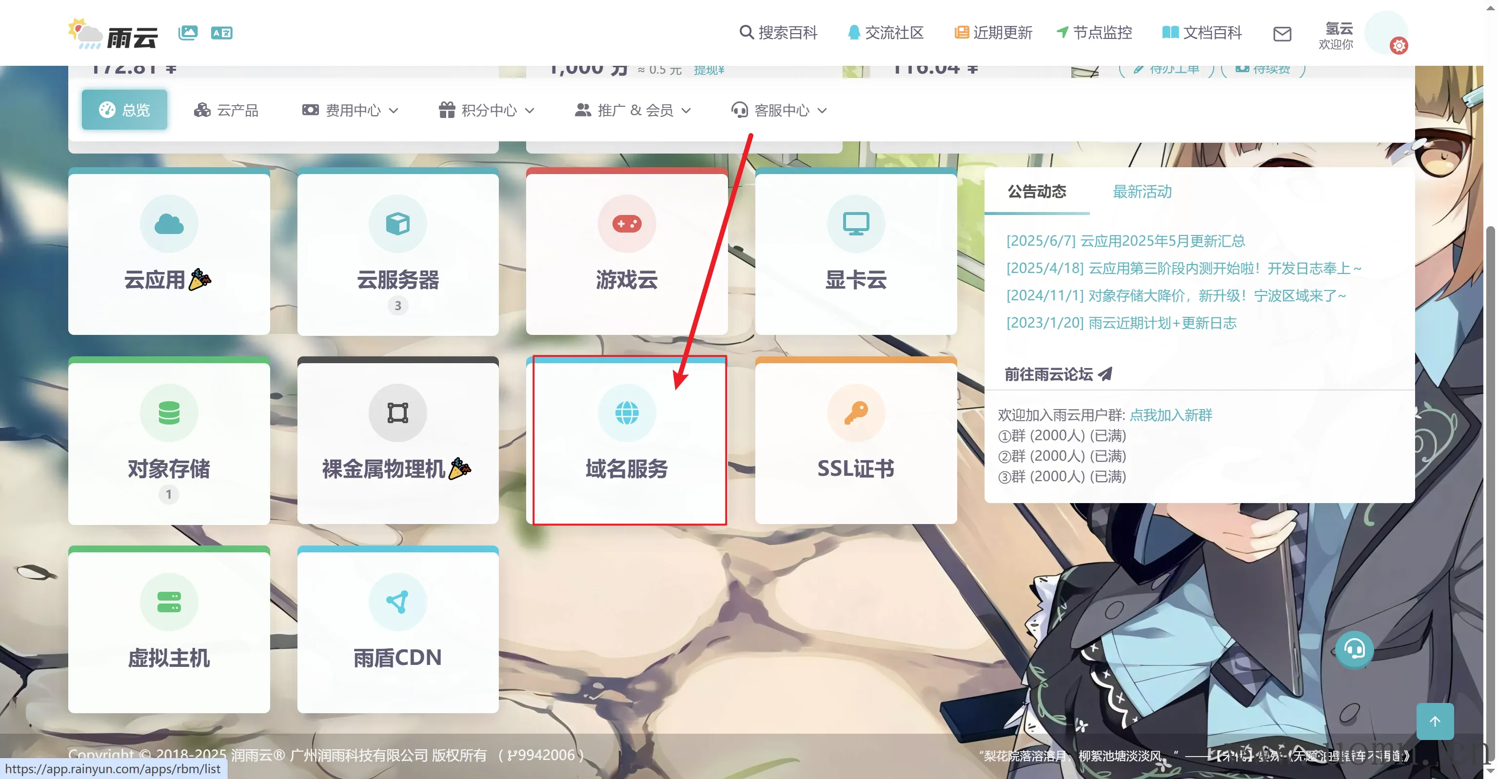 首先进入雨云控制台->点击域名服务