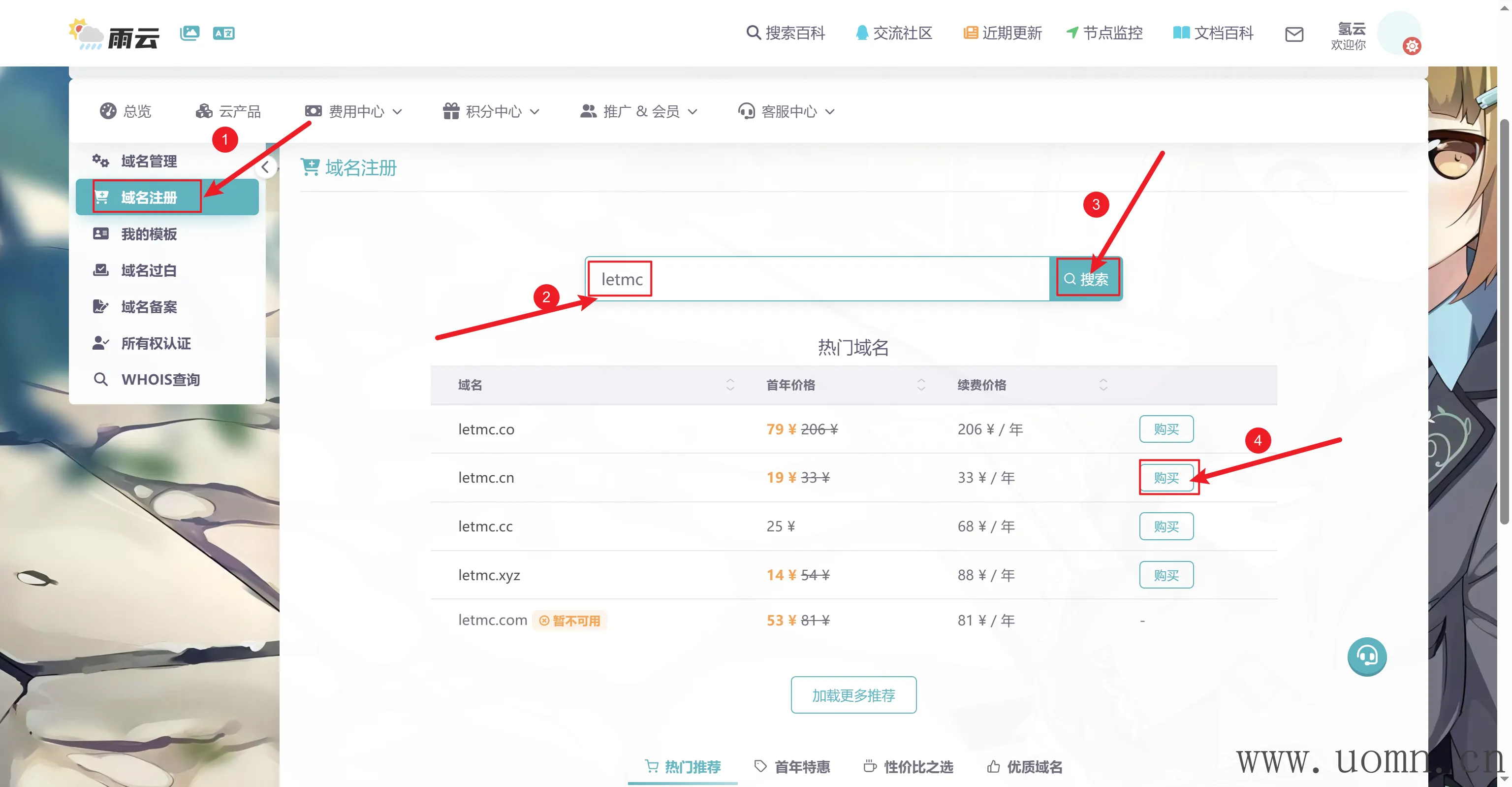 点击域名注册->输入你想要的域名->搜索->然后选择你想要的点购买