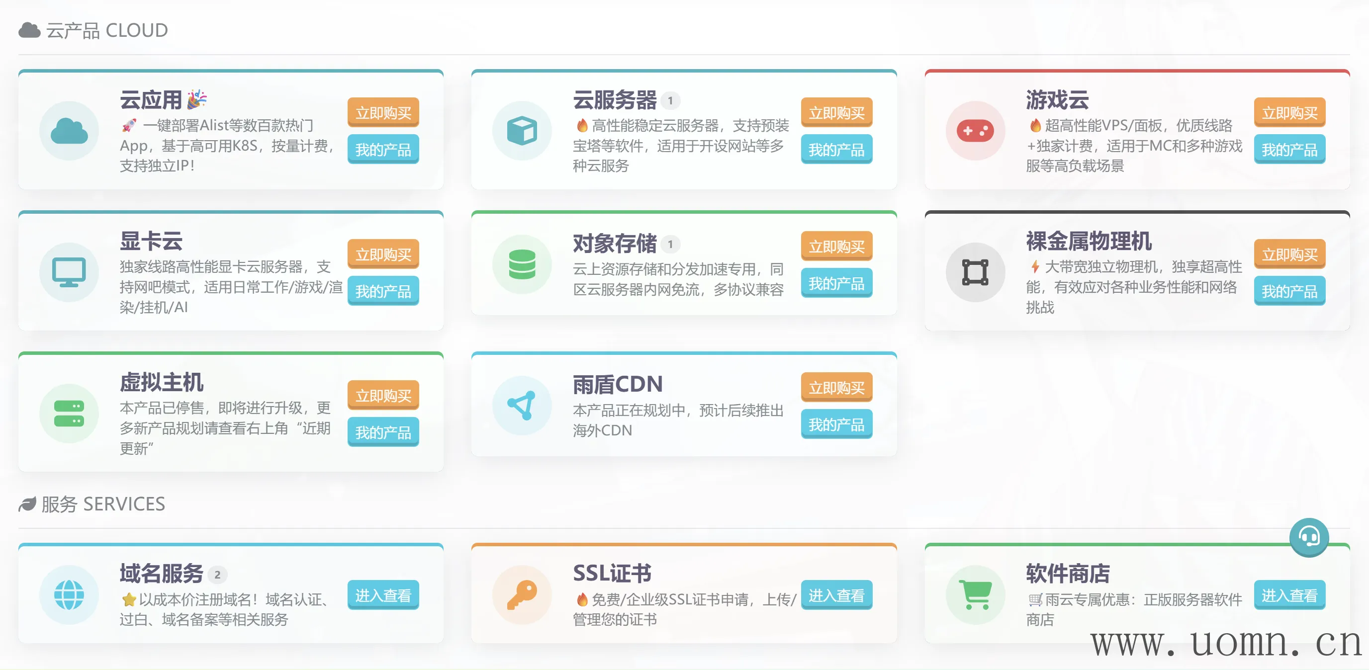 雨云成立于 2018年, 是具有自主知识产权的国产云计算服务提供商。 雨云为广大用户提供简单易用、便宜实惠、可信赖的云产品。 主营包括云服务器、裸金属物理机、虚拟主机、游戏云、对象存储、CDN内容分发等广受好评的云服务产品。
