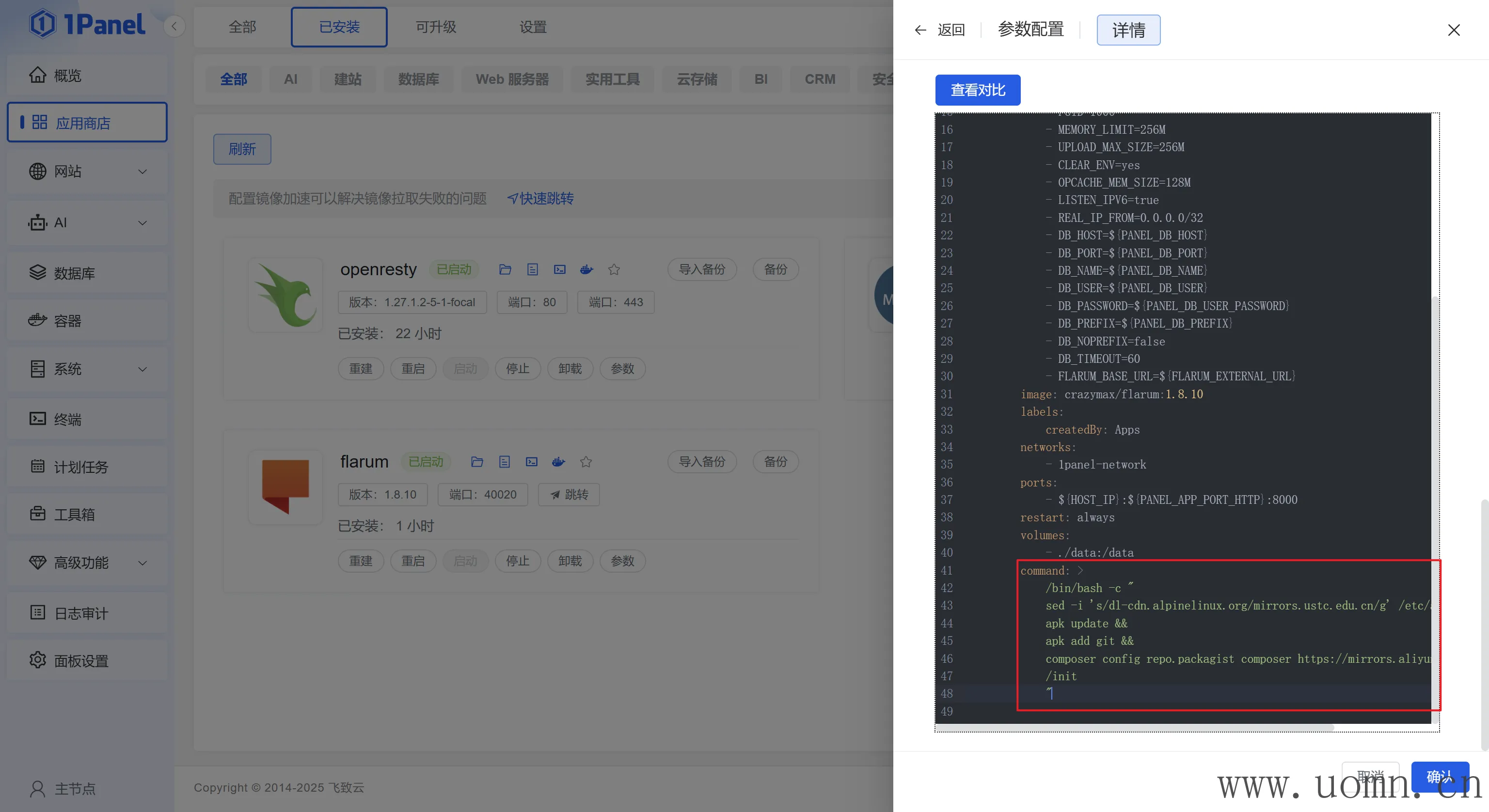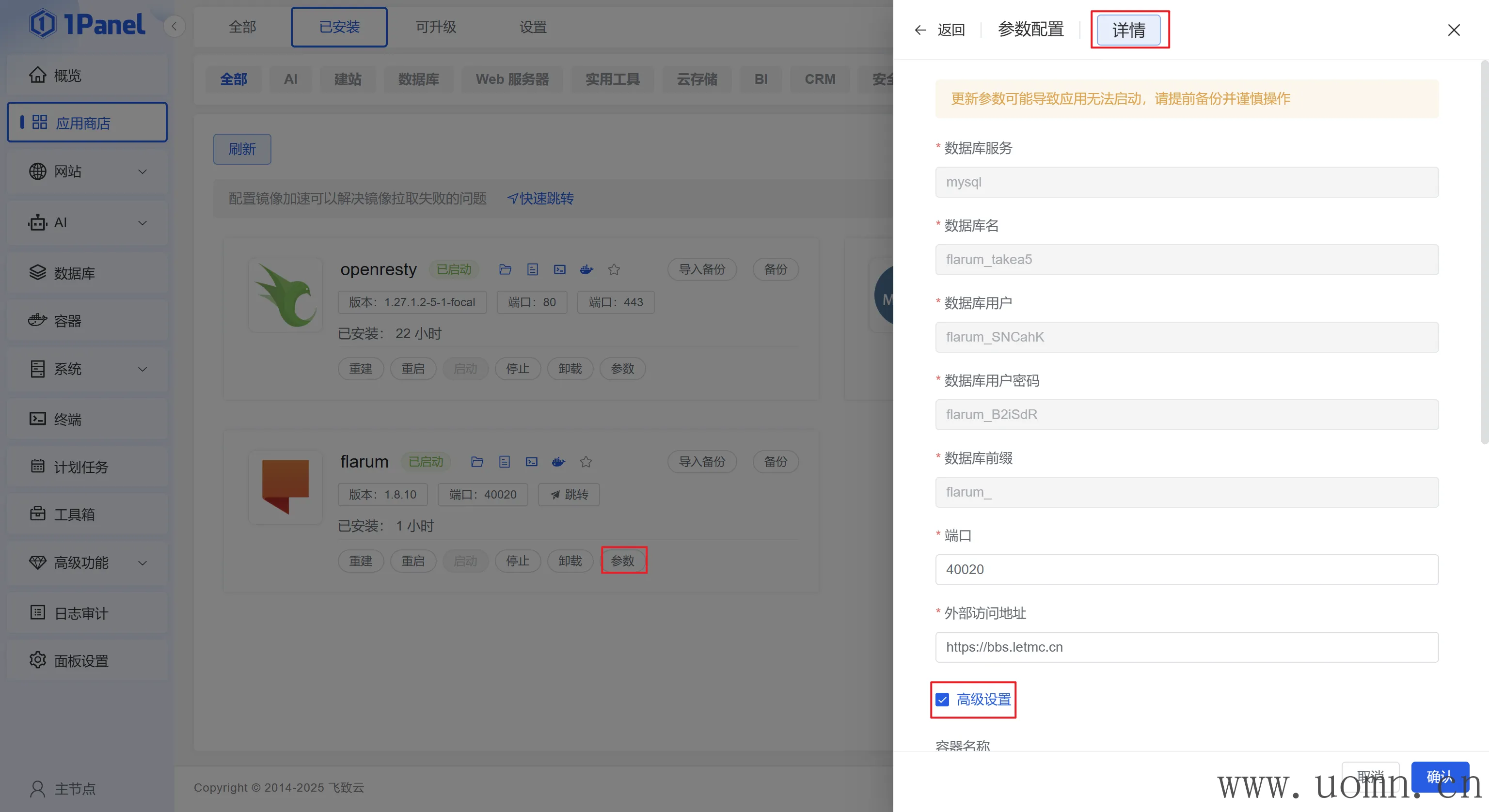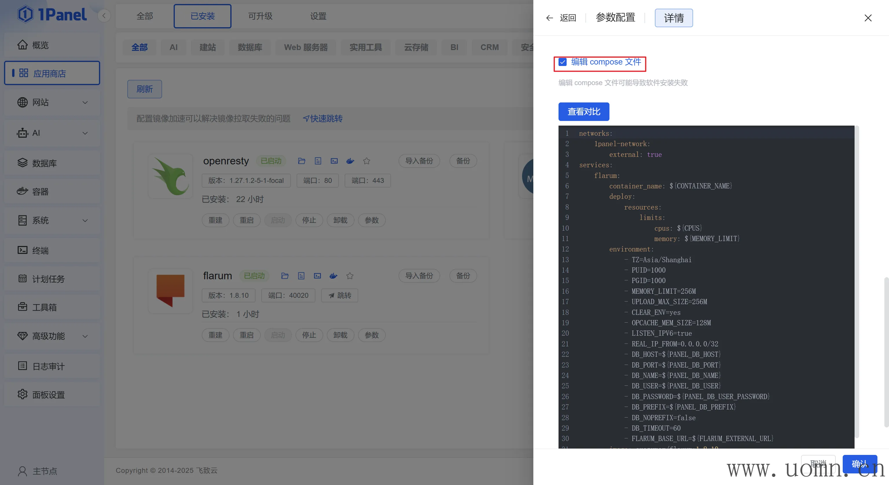 首先找到安装的Flarum应用,点击参数->编辑->勾选高级设置->勾选编辑compose文件
