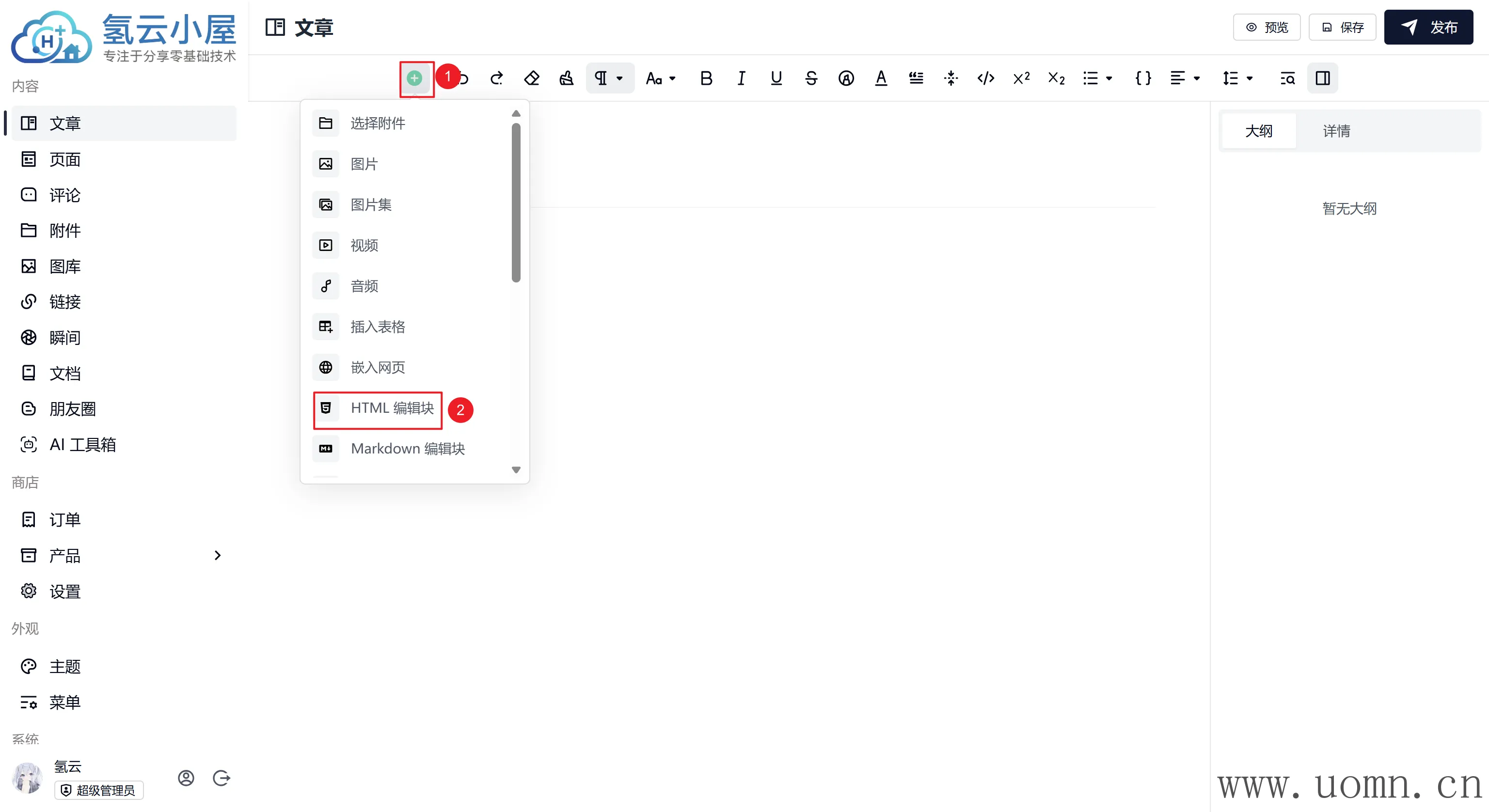 在写文章时,将内容组件放到HTML编辑块中