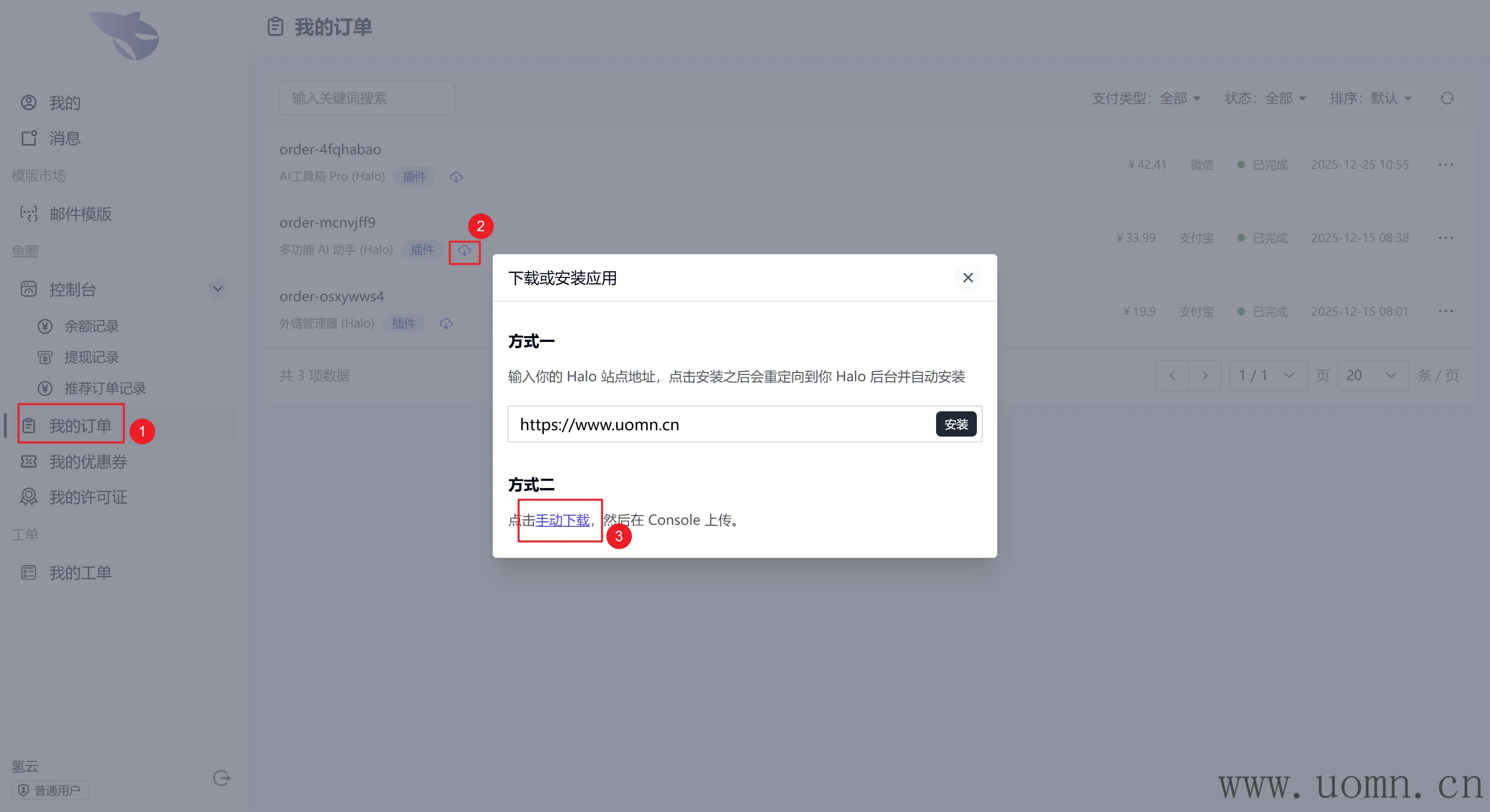 在购买插件后,前往我的订单页面下载插件安装包