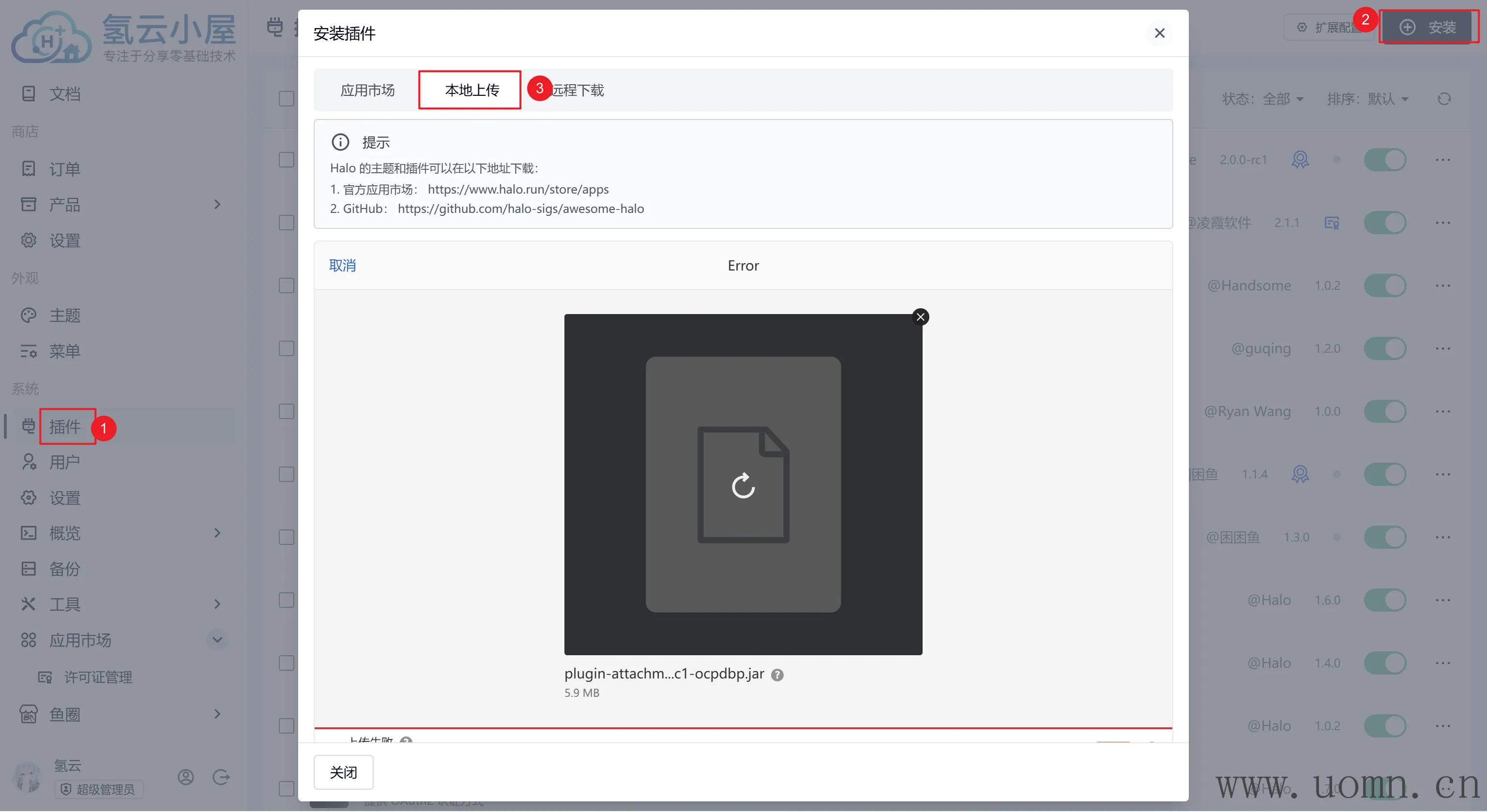 回到Halo后台的插件页面,点右上角安装,上传刚才下载的插件文件