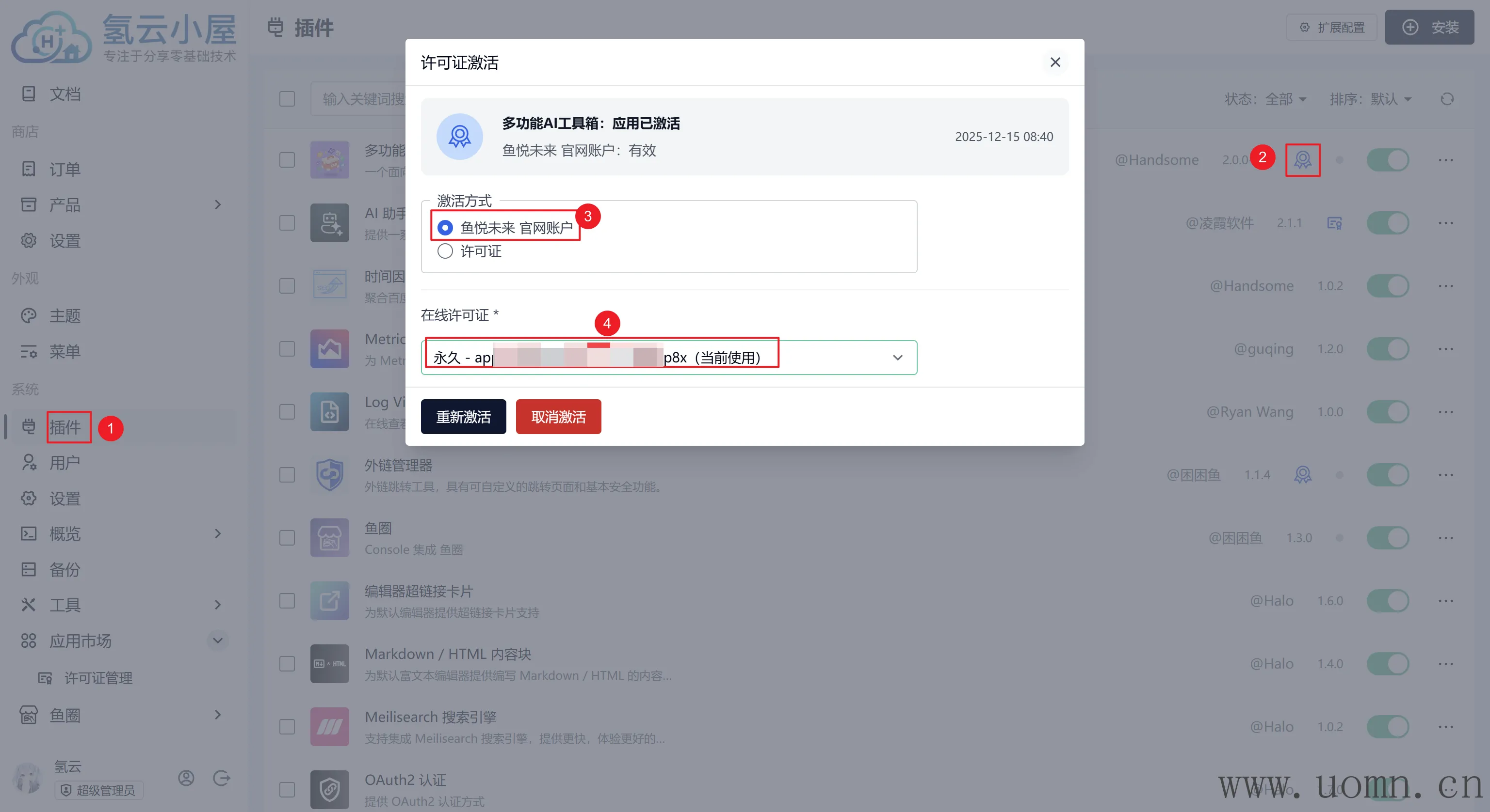 如果激活后,许可证图标显示是红的,可以手动关闭并启用一下子多功能AI工具箱插件。