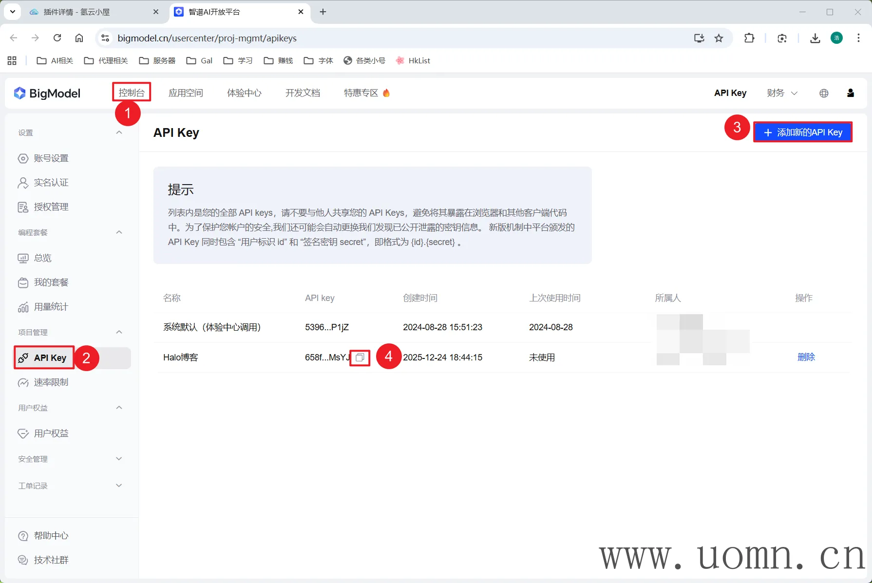 点击下方网址进行注册登录,进入到控制台,创建API Key