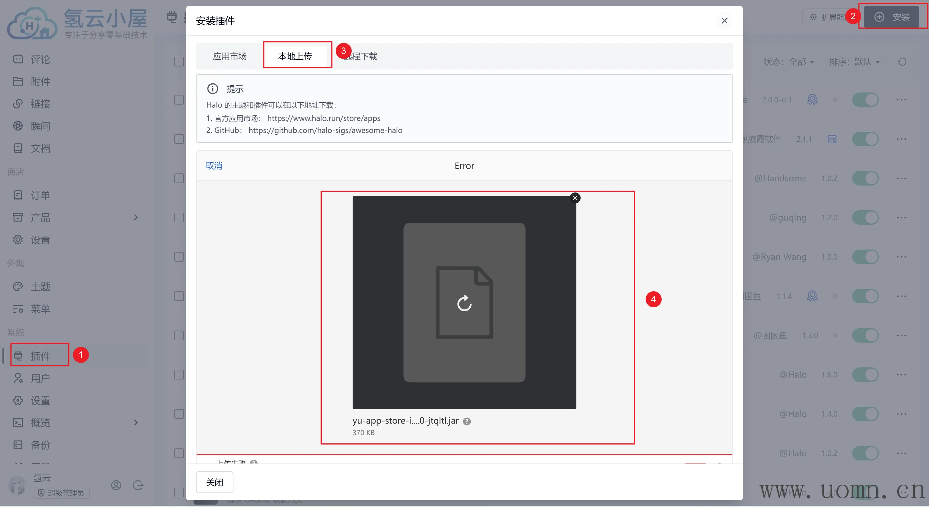 回到Halo后台:插件->安装->本地上传->上传刚才下载的文件