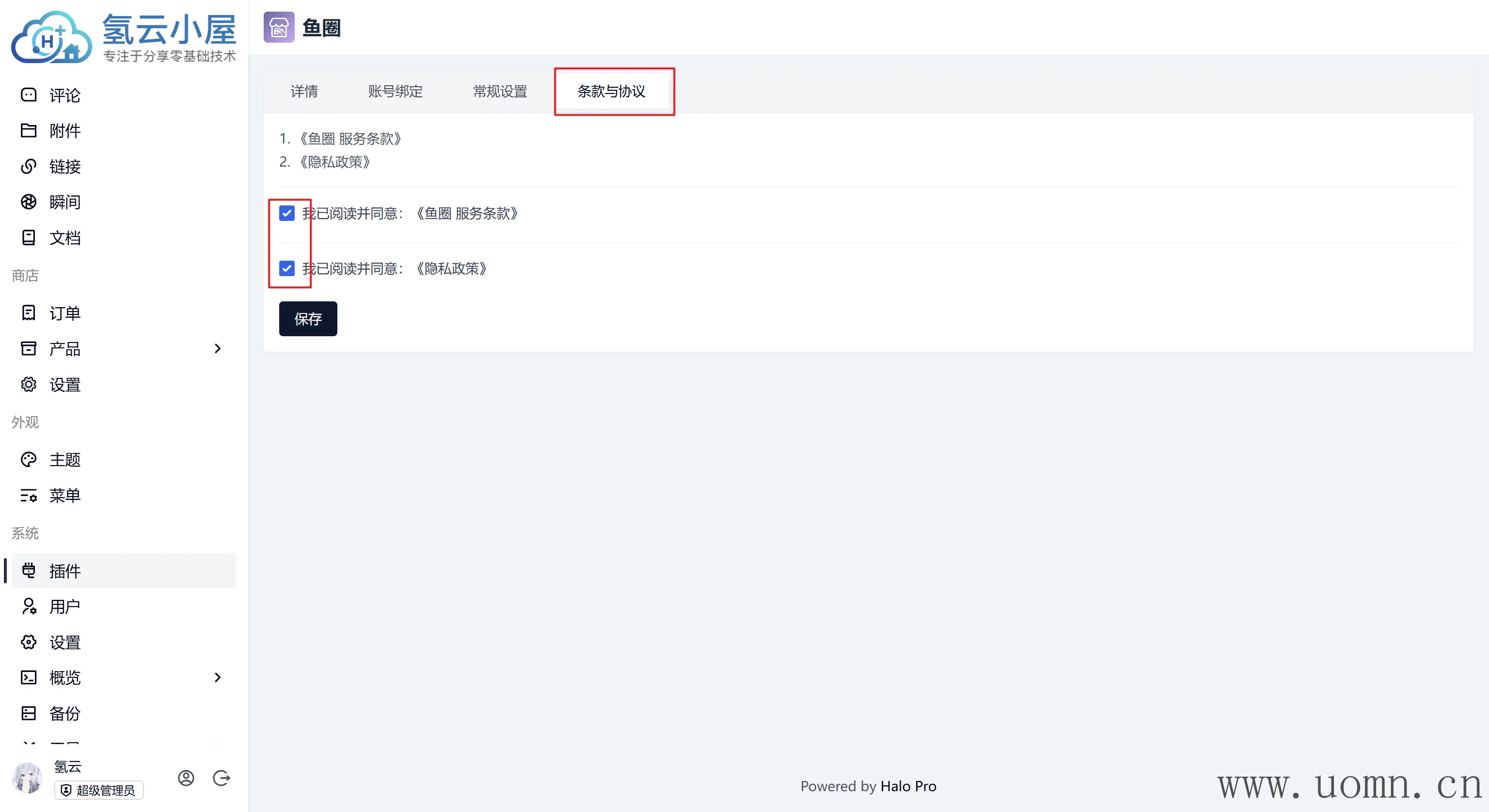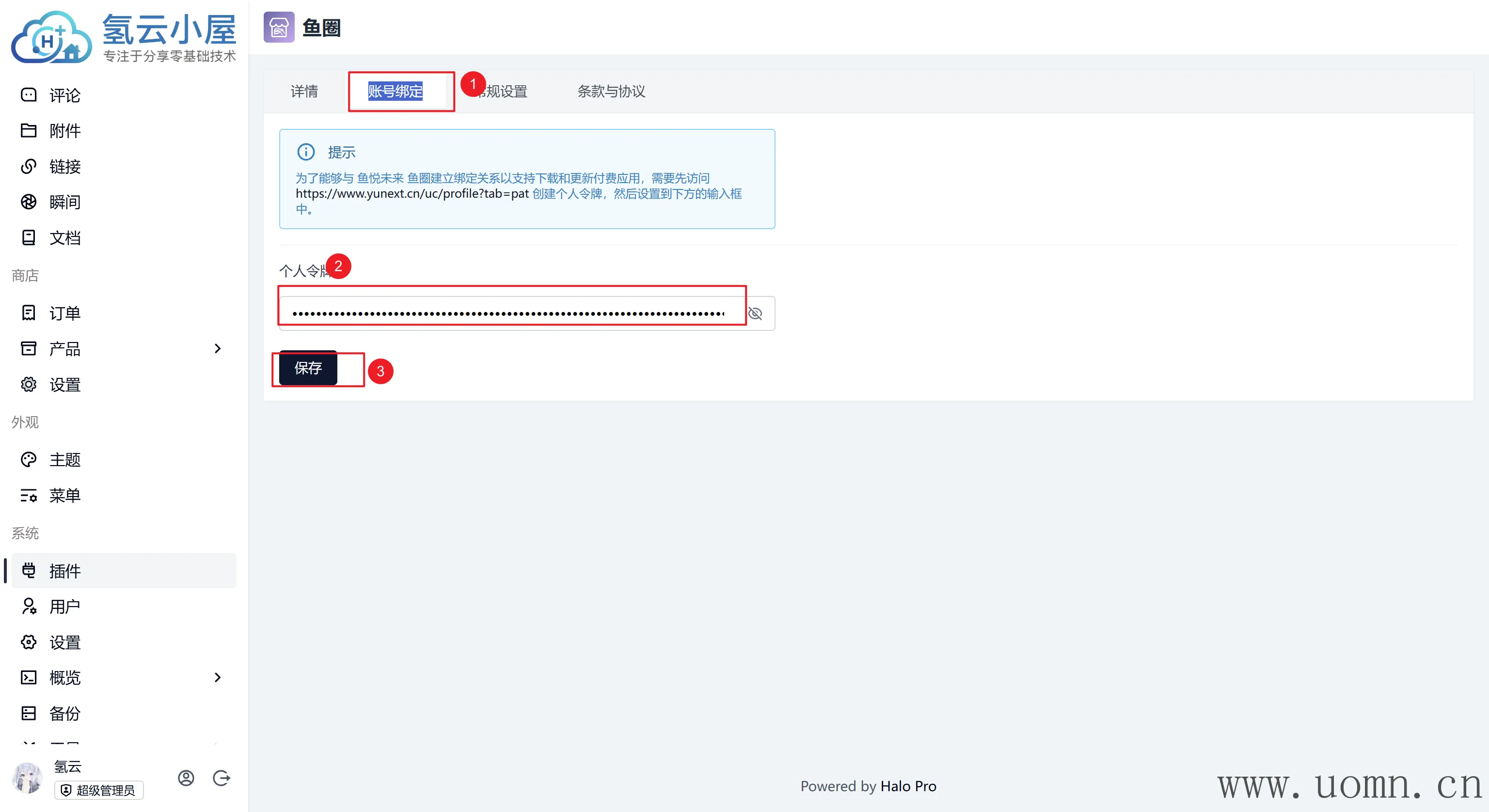 返回Halo后台的插件设置,切换到账号绑定页面,输入刚复制的Token并保存