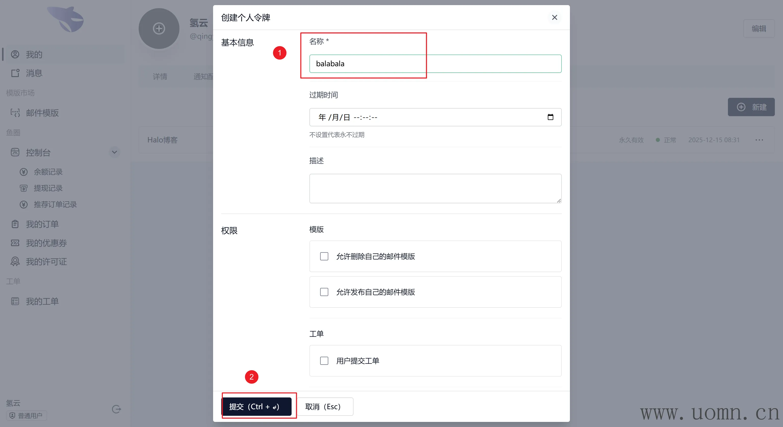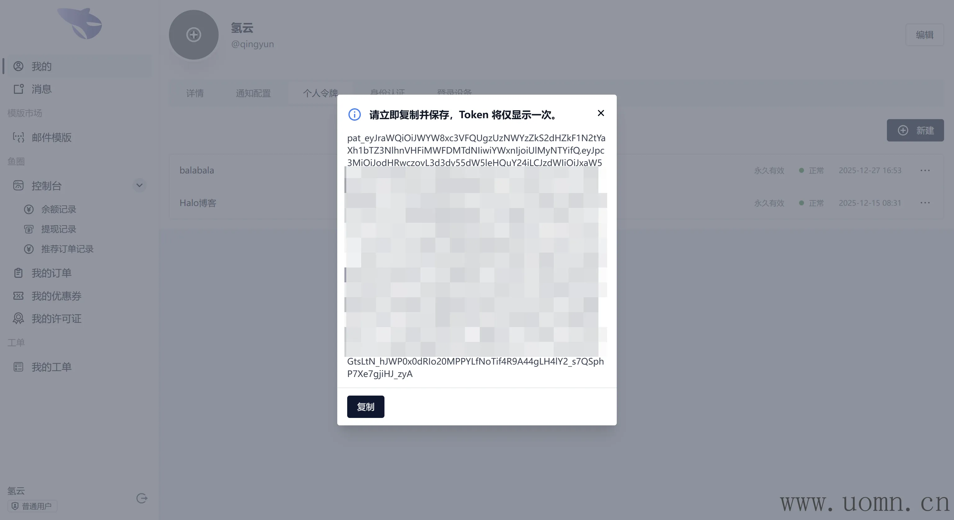 点击提交后弹出Token窗口,点复制后会自动消失,如若误触导致没复制上,可删除后重新创建