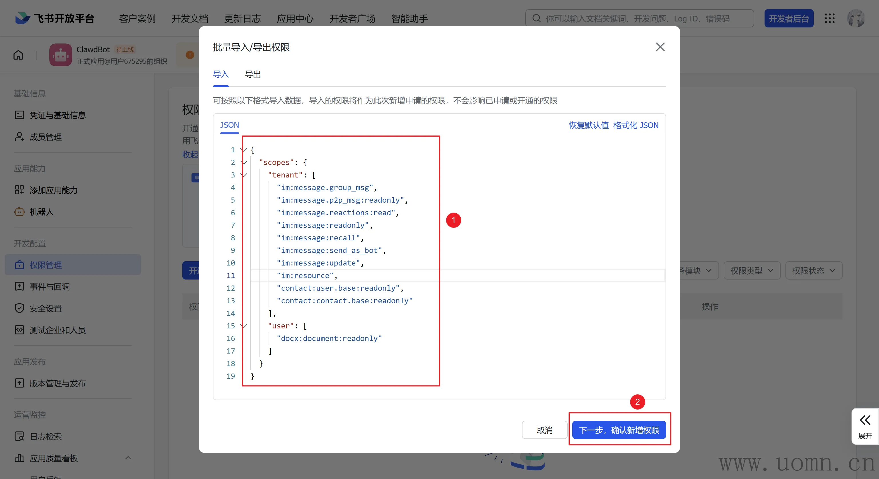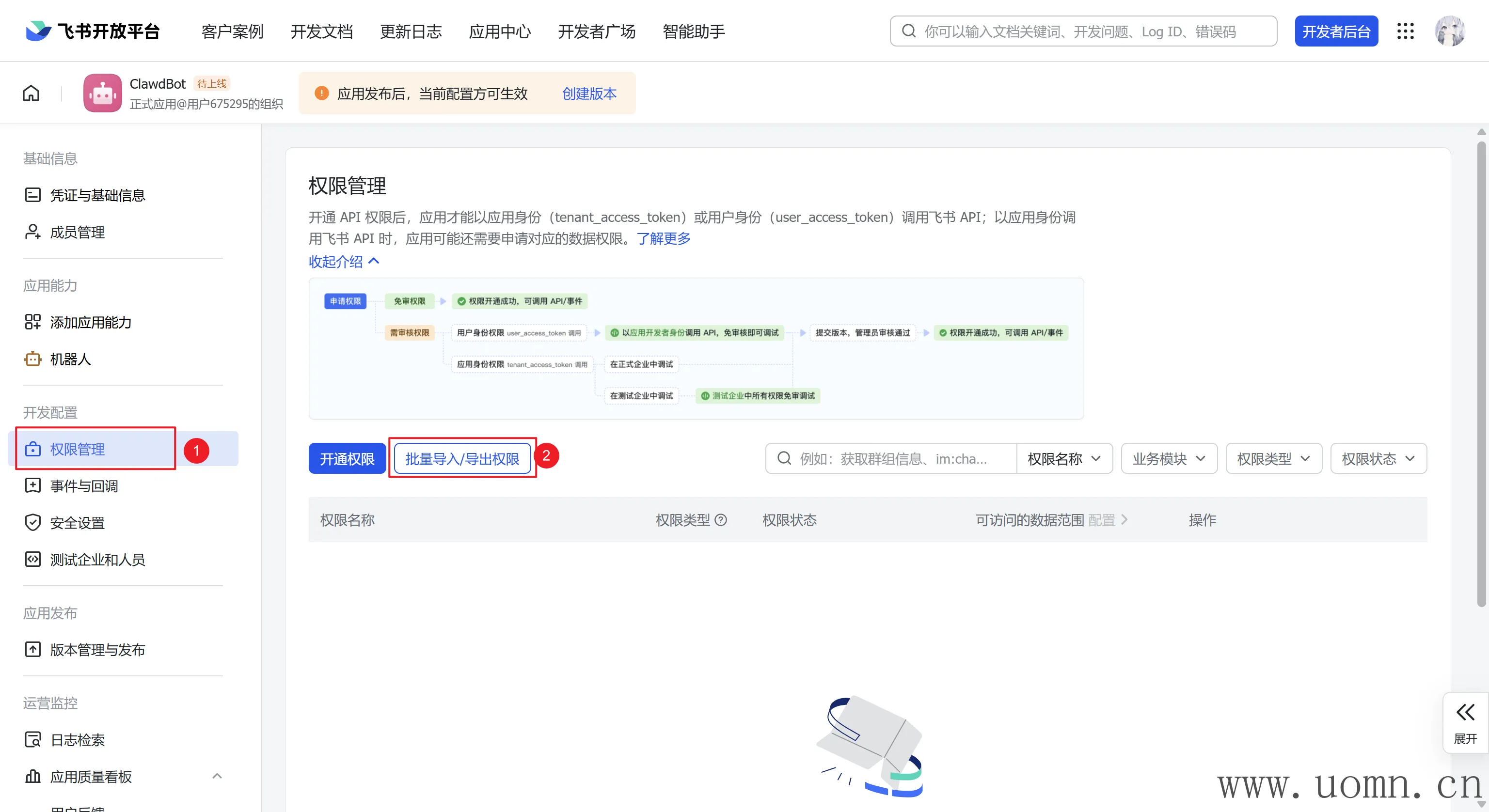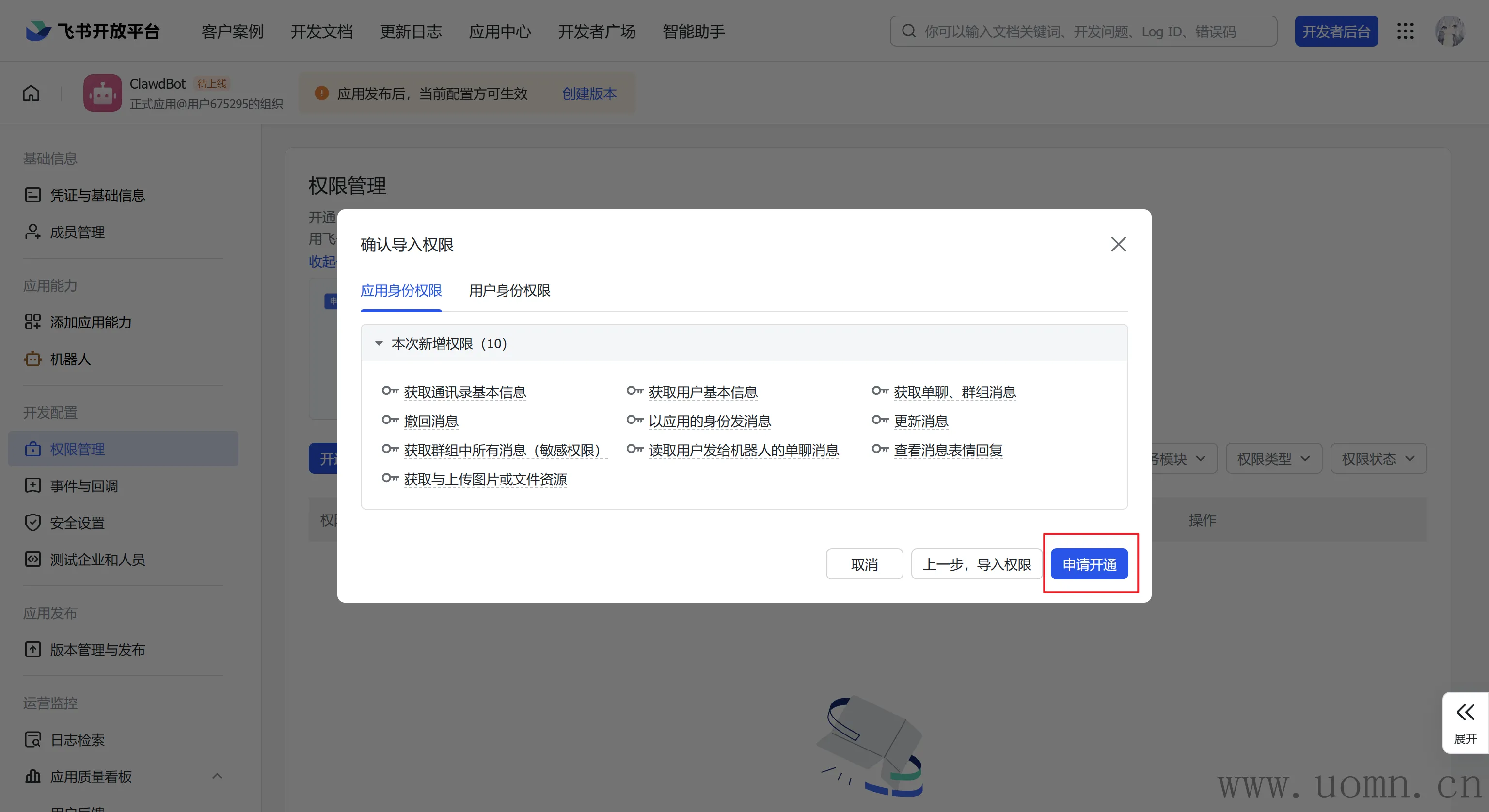 然后返回飞书的开放平台,开通一下子权限
