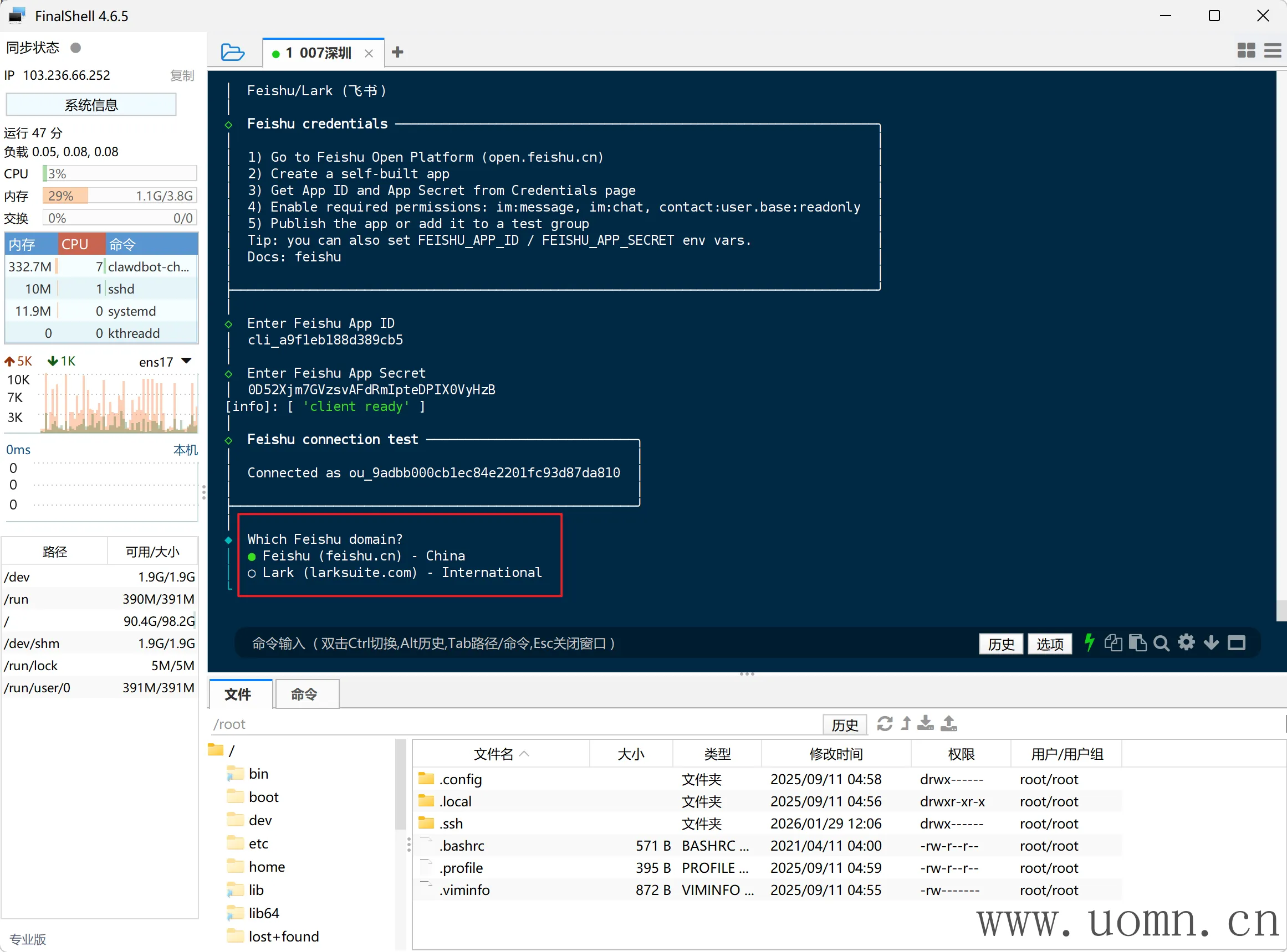 然后让你选择飞书的域名,国内则选第一个,国外选第二个。一般都是选第一个