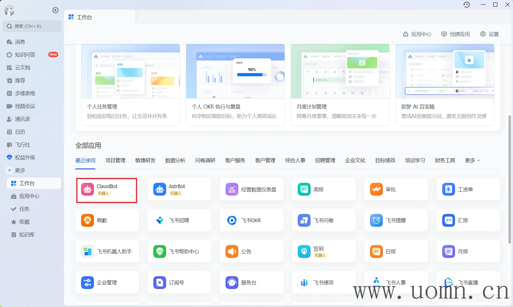在飞书的工作台中能找到你刚发布的机器人,双击进去就能用啦