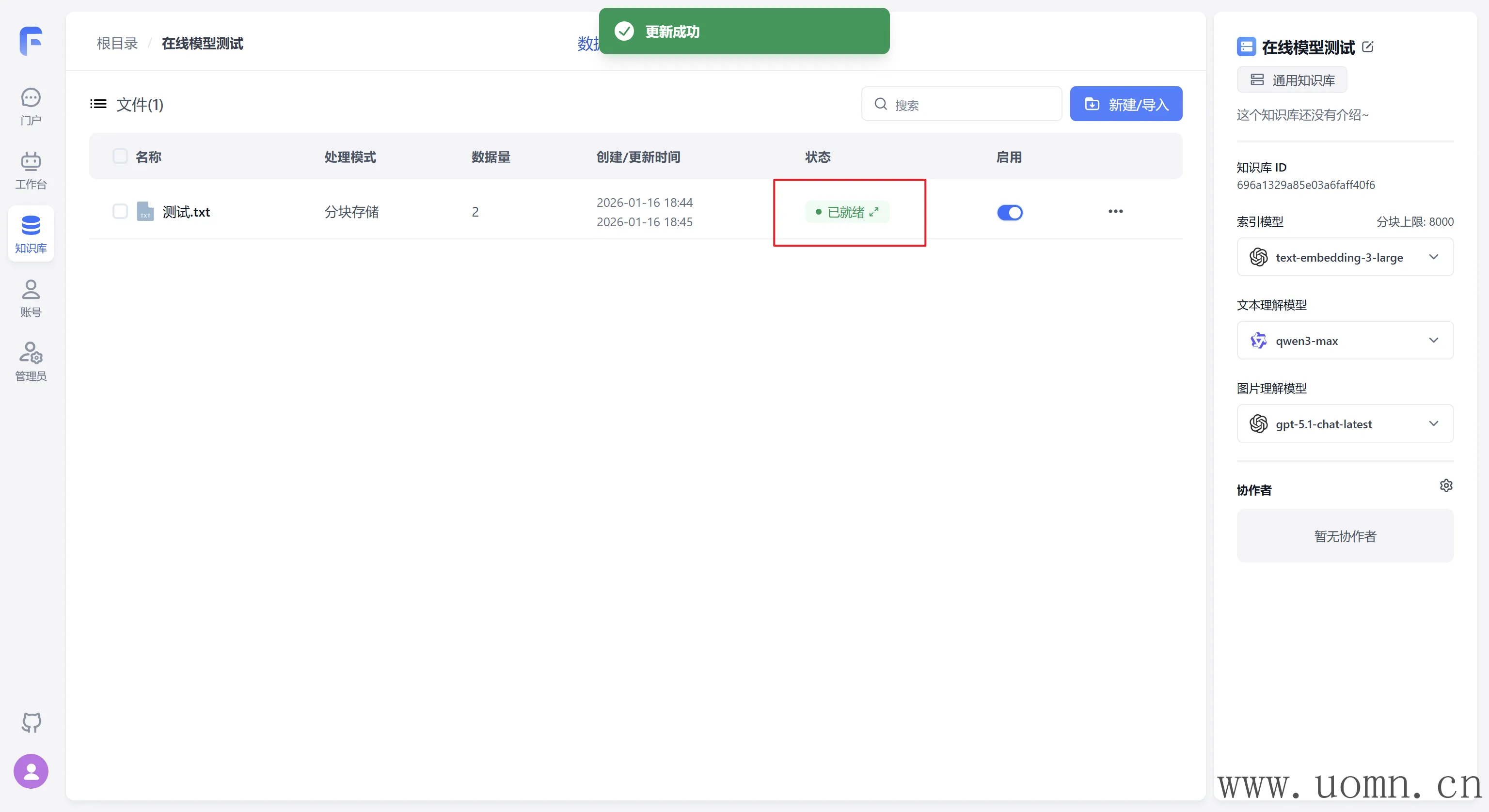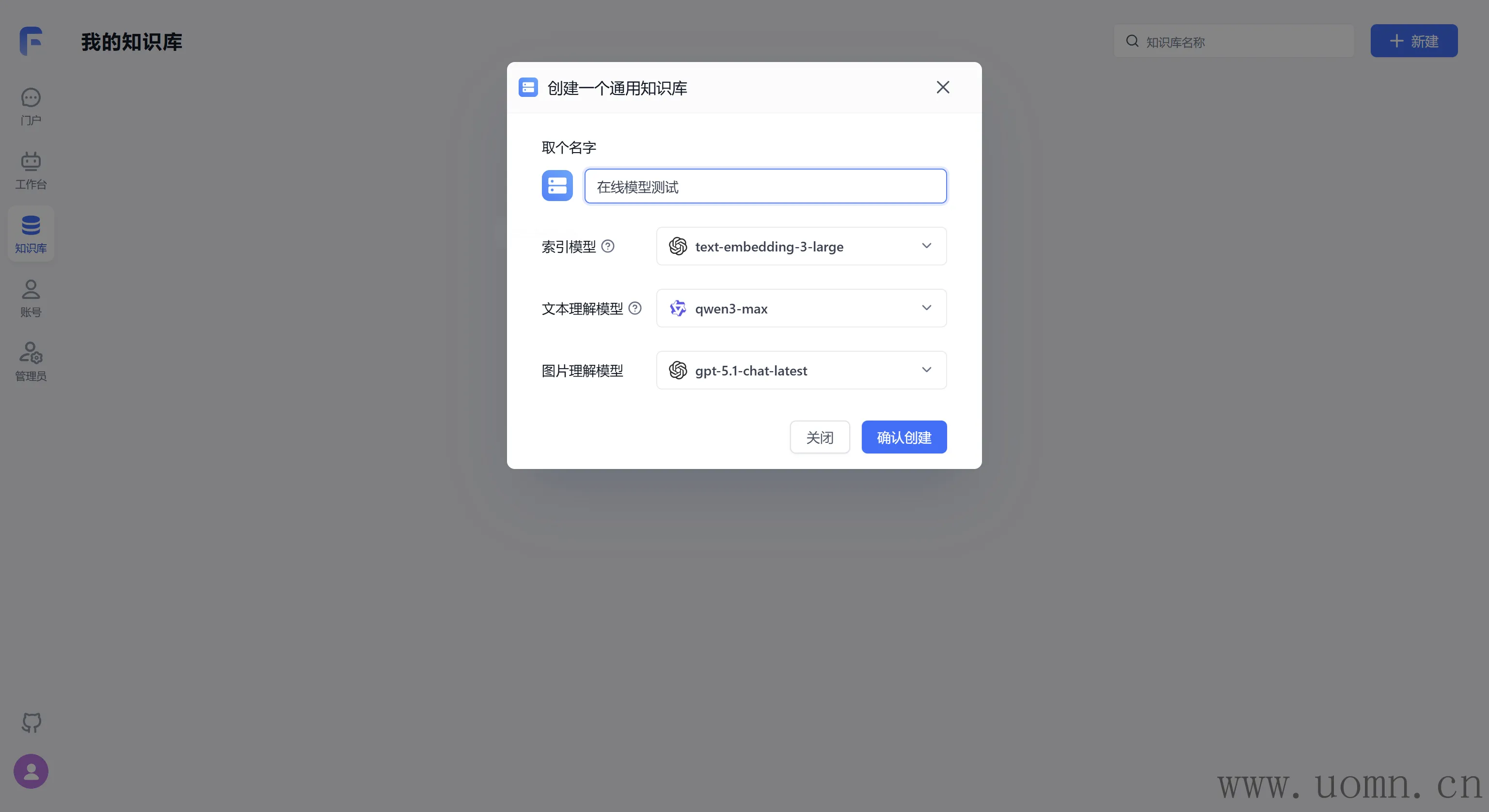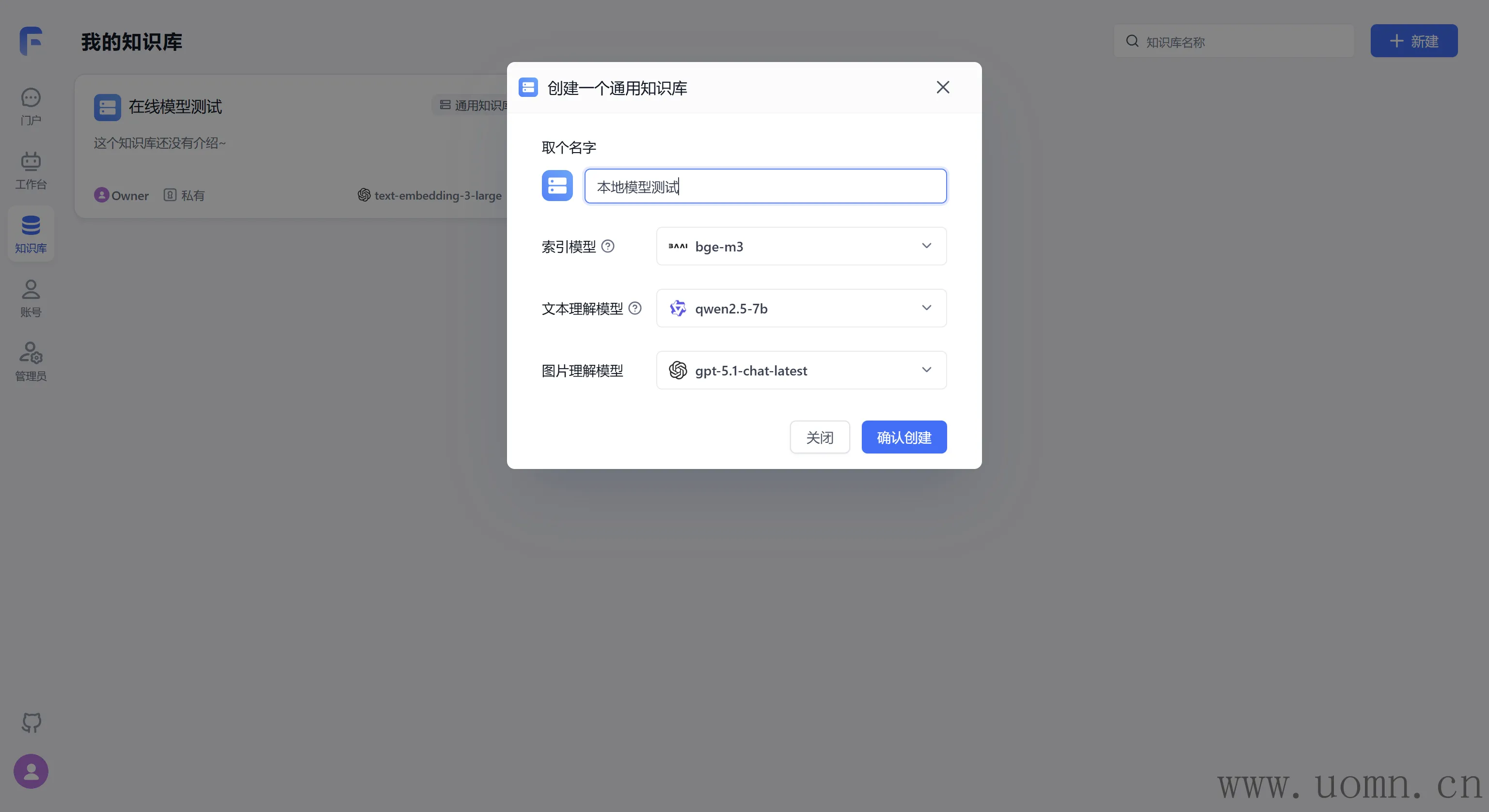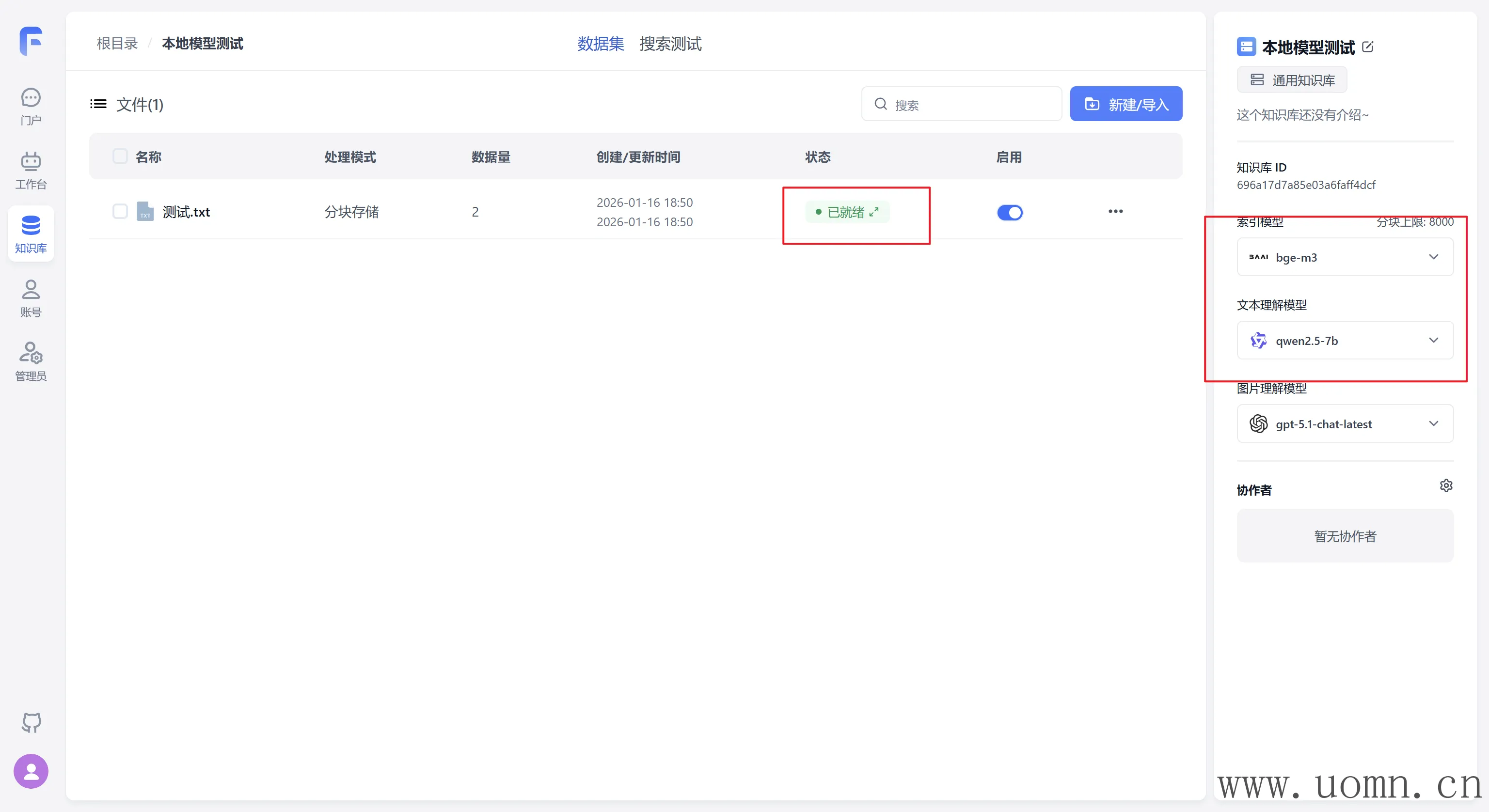 嵌入模型需要创建两个知识库,一个用于测试在线模型,一个测试本地模型