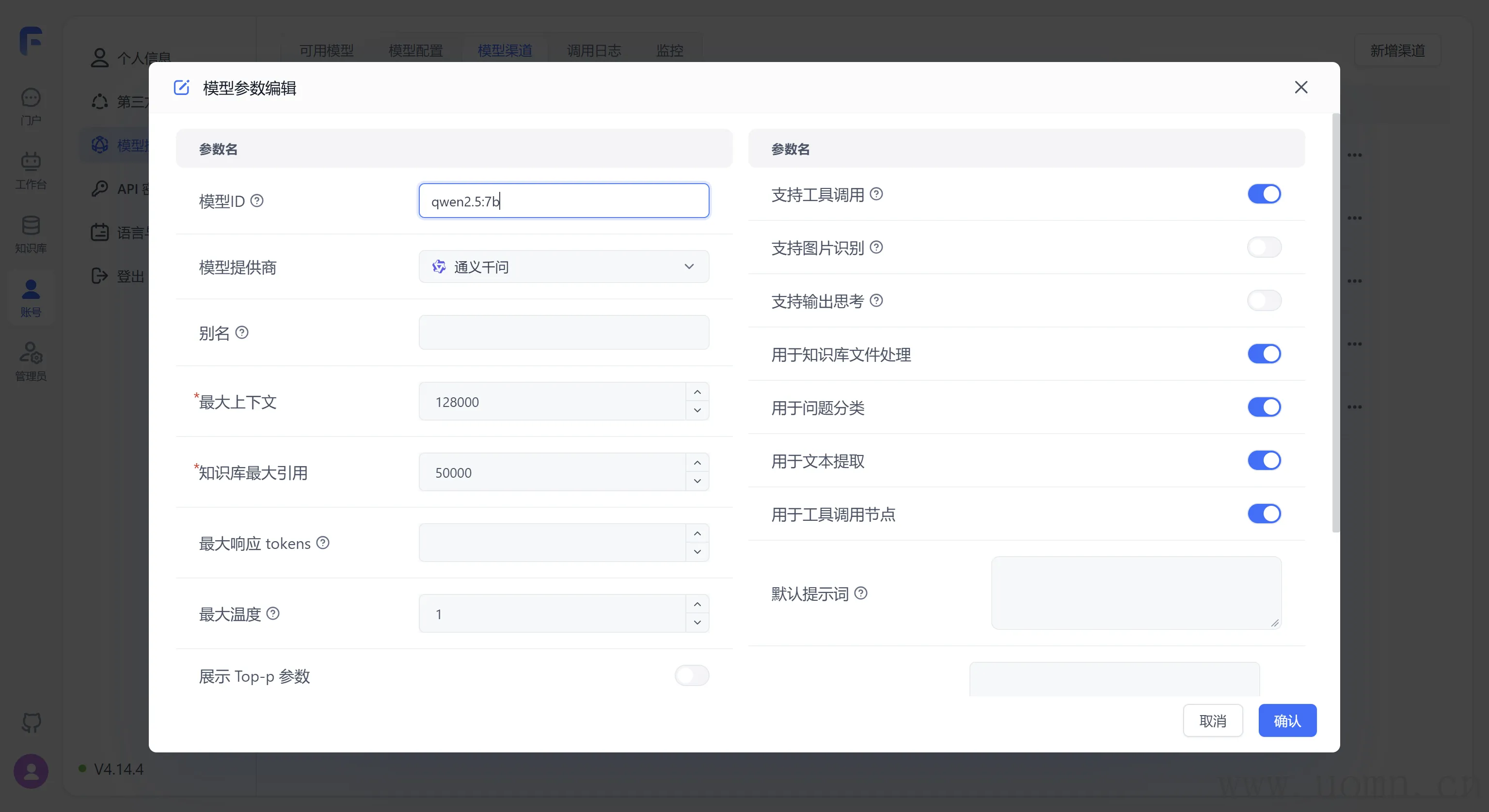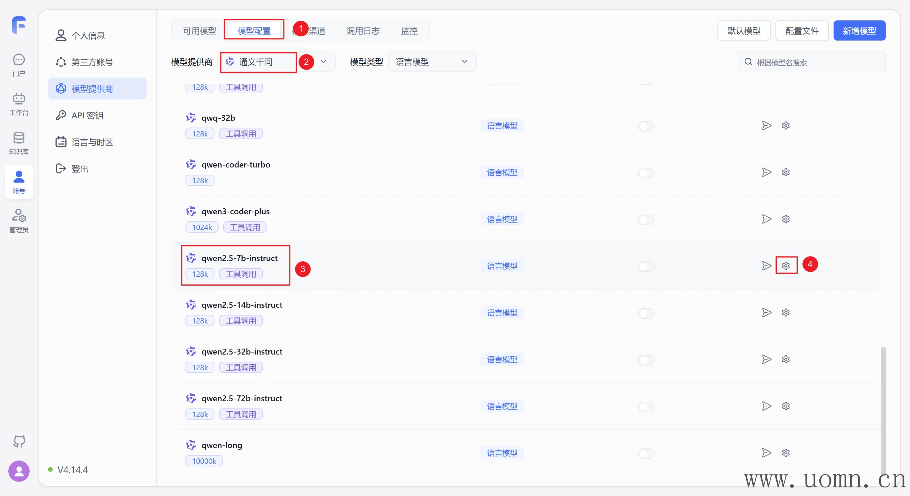 例如,这个qwen2.5:7b模型,在FastGPT里边就没有对应的,这是语言模型,那就新增一个语言模型
