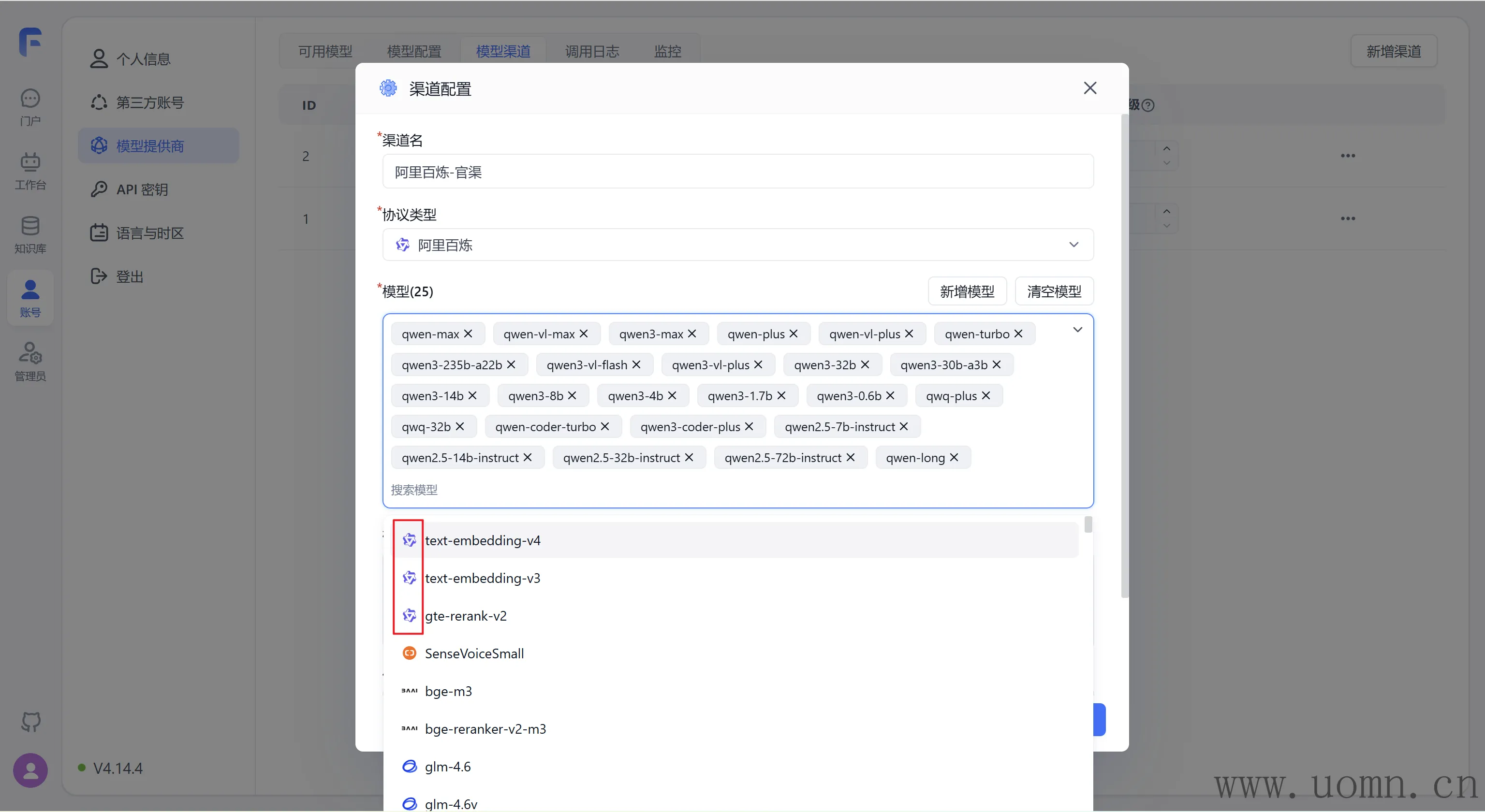 关于模型选择,只要有阿里百炼图标的都选上,如下图