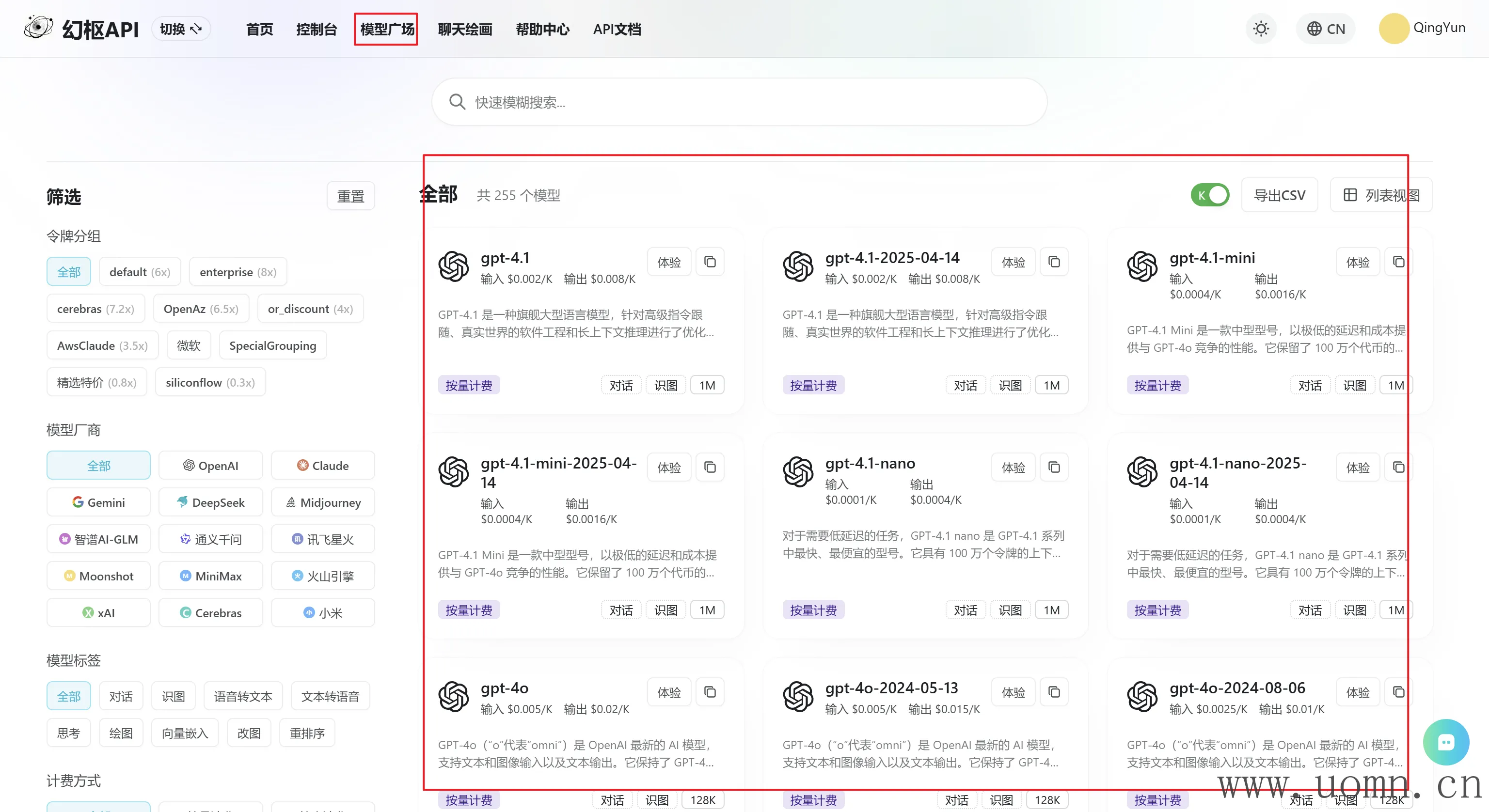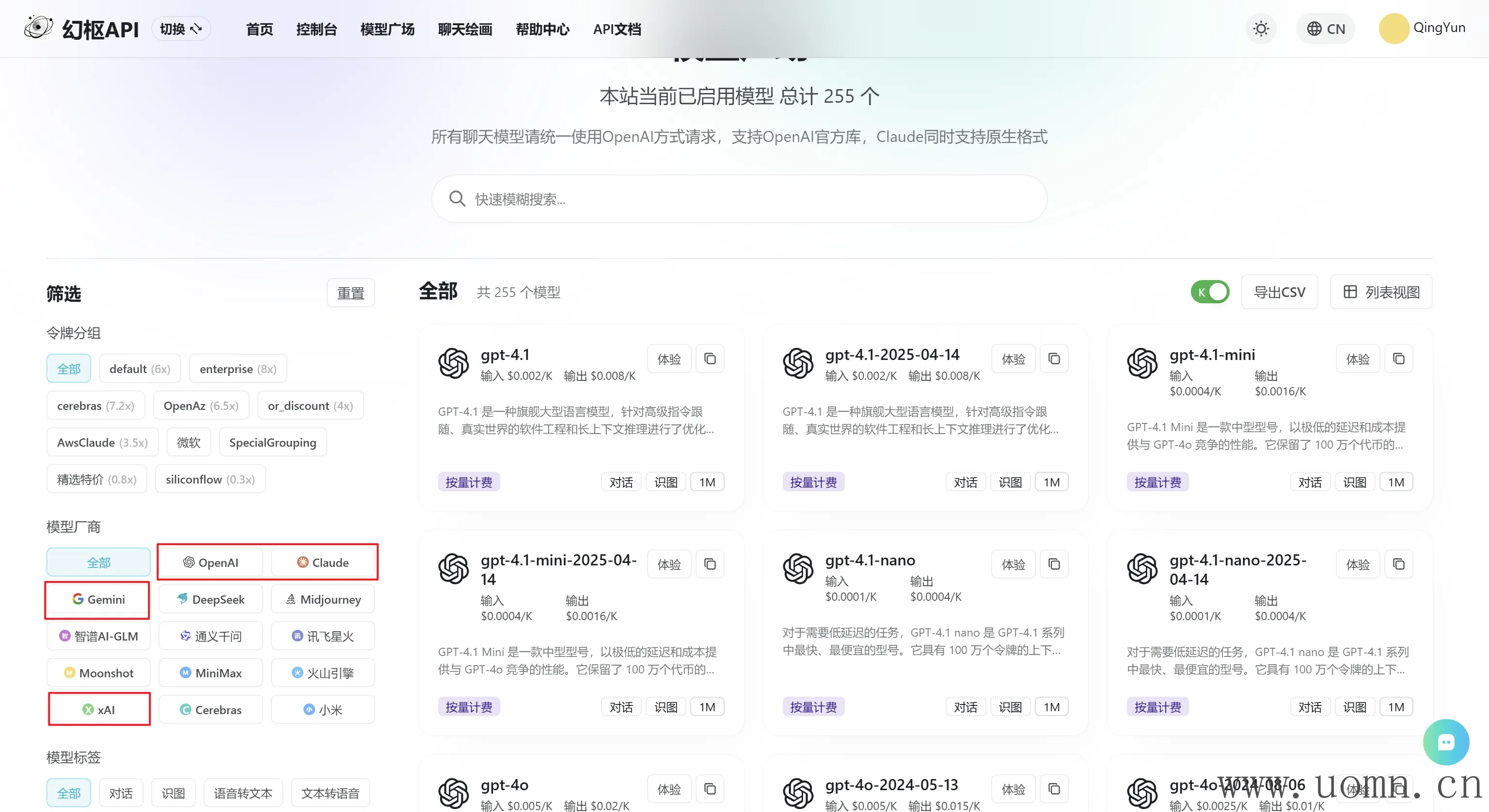 模型众多,不必在各个官方服务商处注册账号、充值、获取密钥,在中转API一处充值即可使用各个服务商的模型