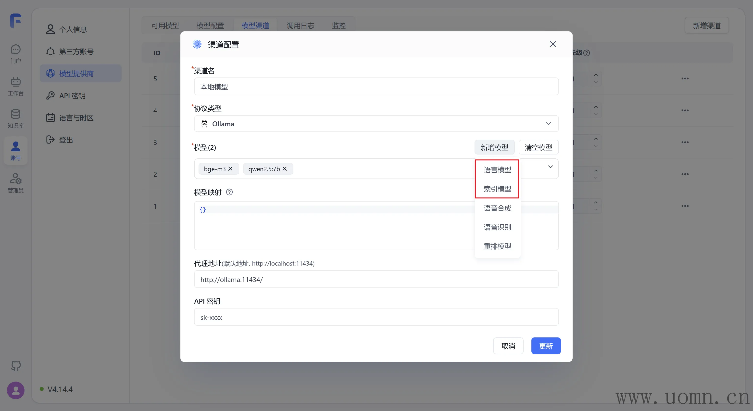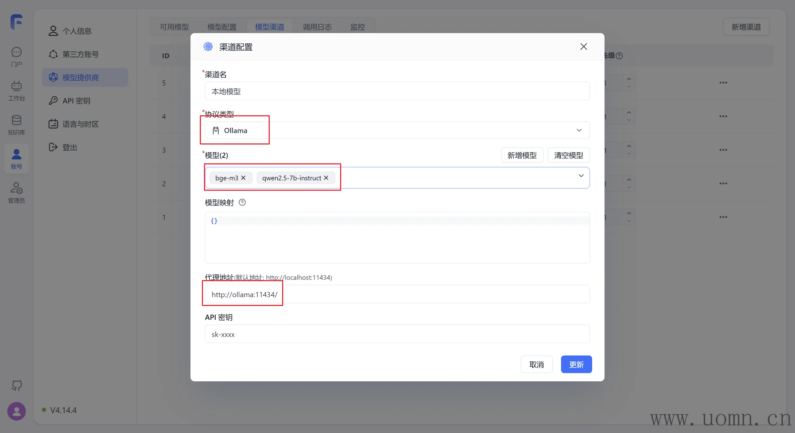 本地模型的接入和在线模型的差不多,都是需要新增渠道