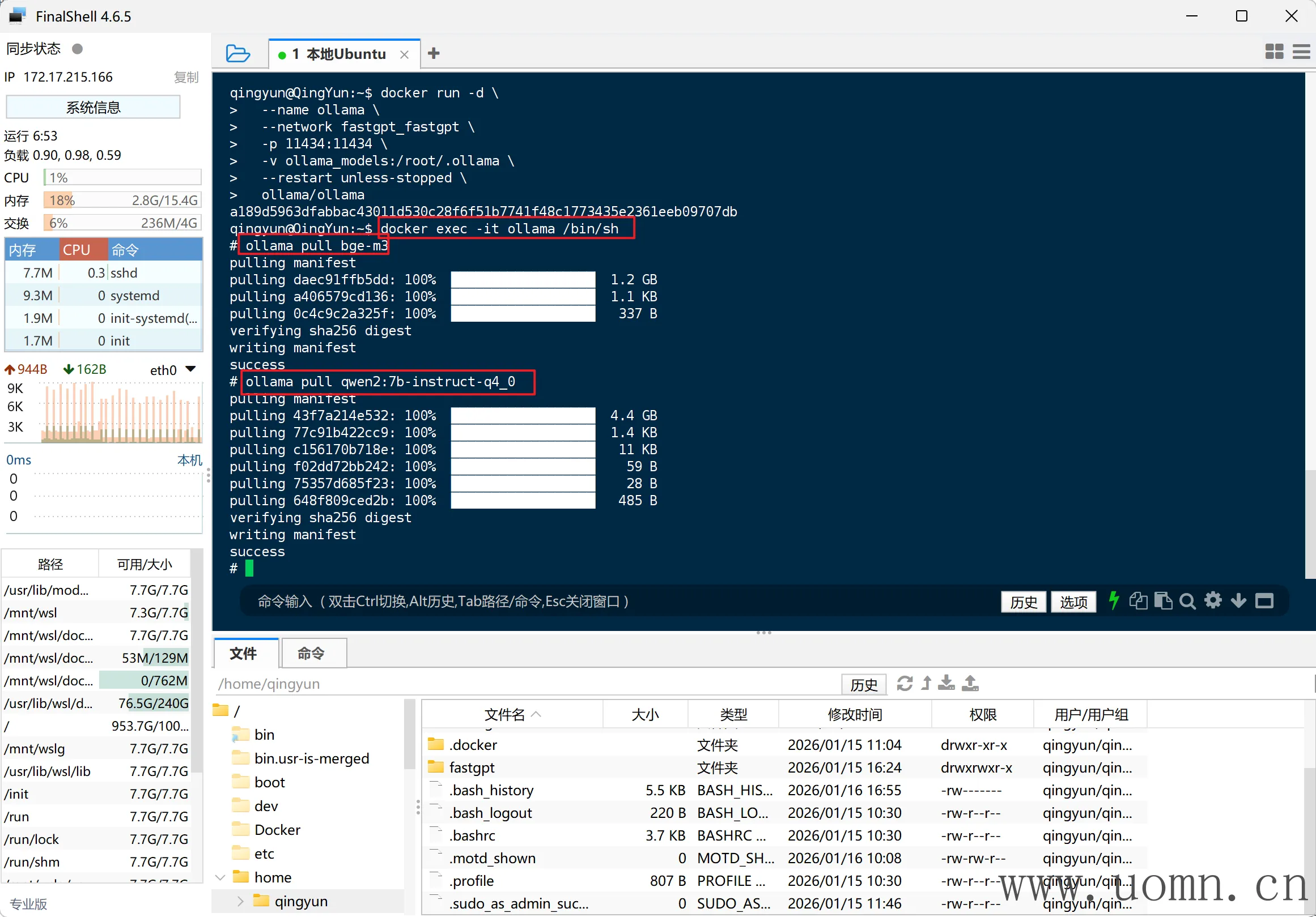 ollama pull qwen2.5:7b后边为了方便接入FastGPT,我把文本模型改为了qwen2.5:7b ,下图中是我之前拉的别的模型,我就不重新截图了