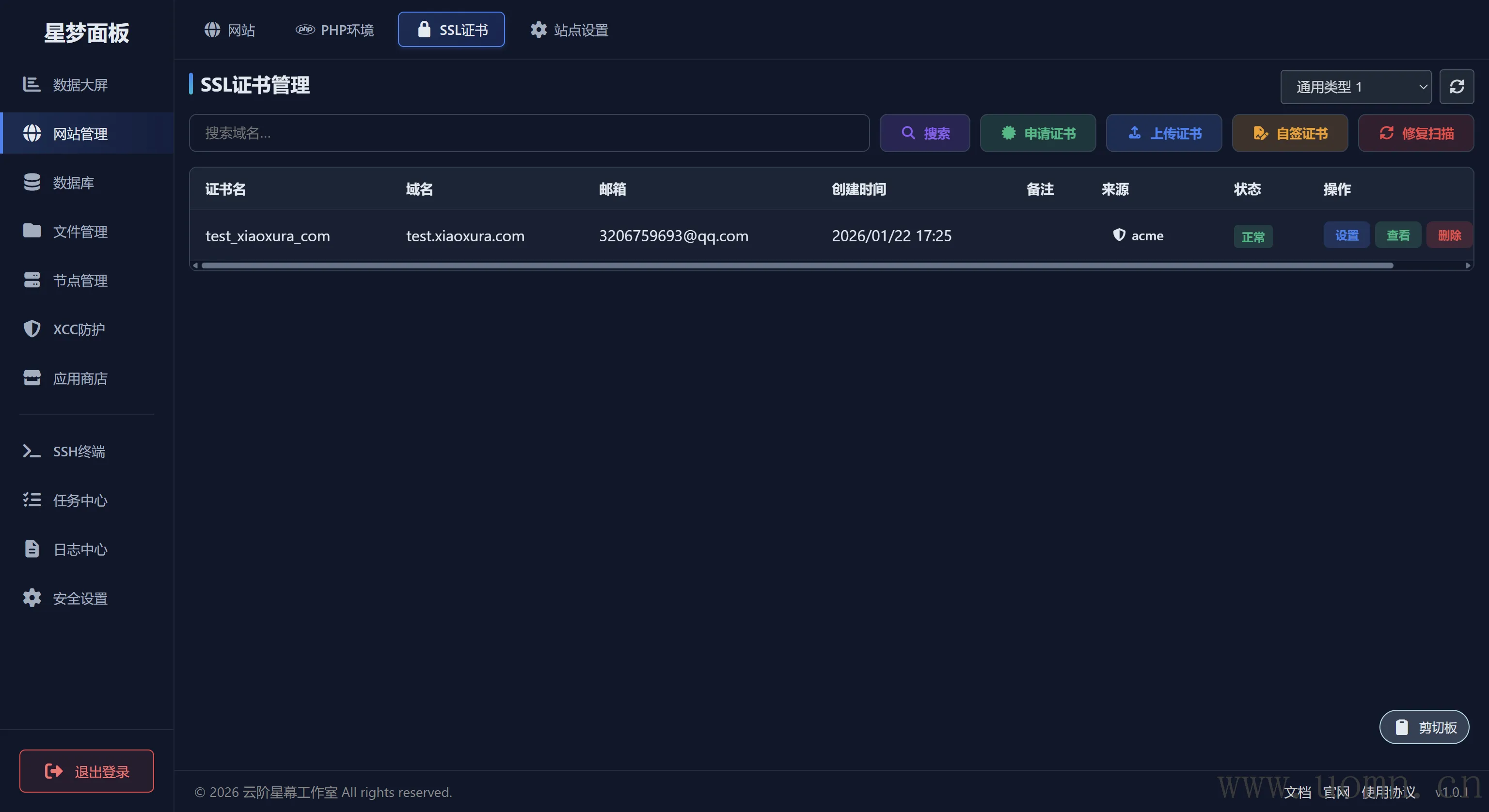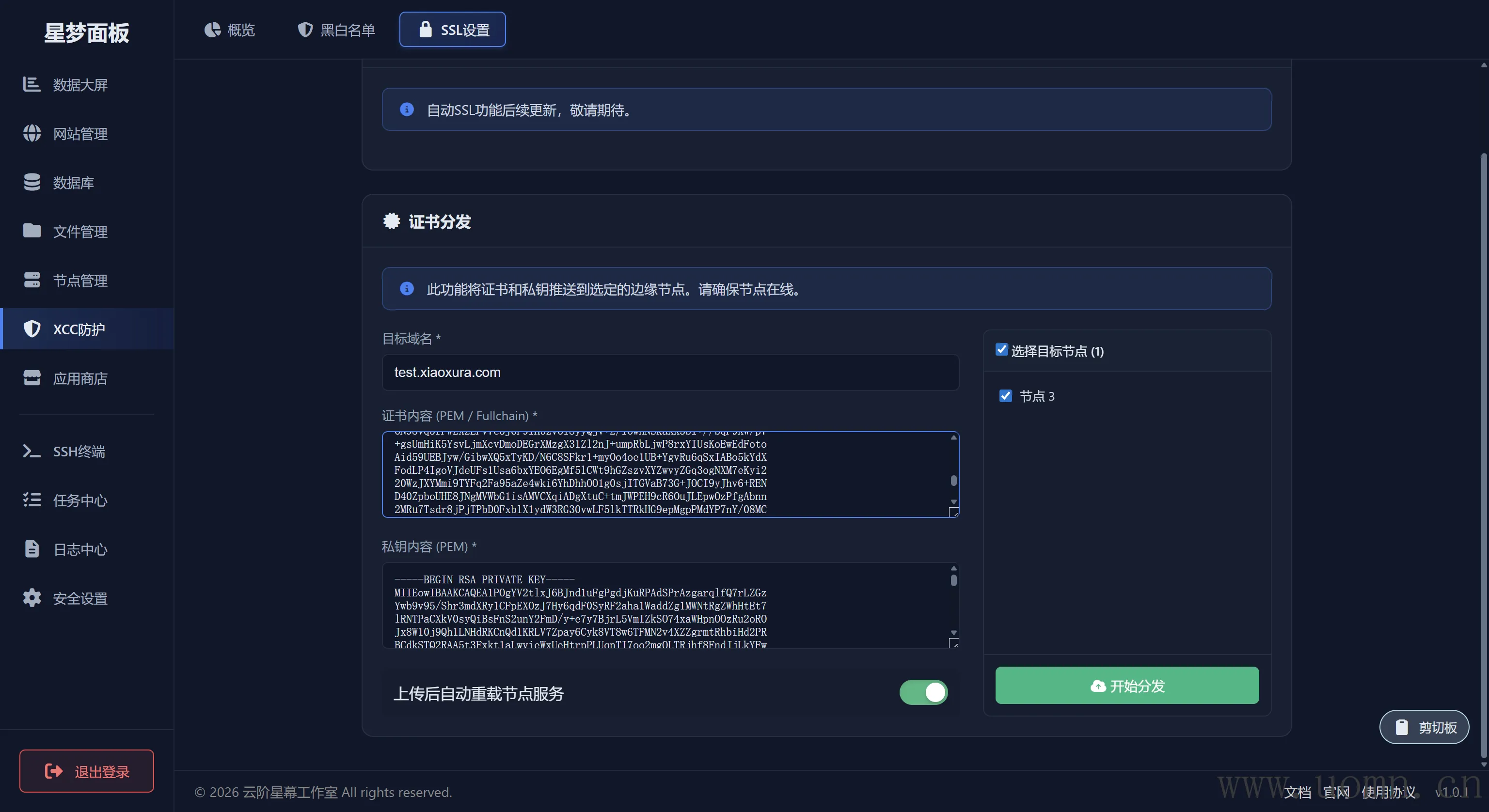 XCC建议配置SSL证书,与之前在网站那里不同的是,这里的证书要手动去第三方申请,然后上传,这里我就不展示这个流程了
