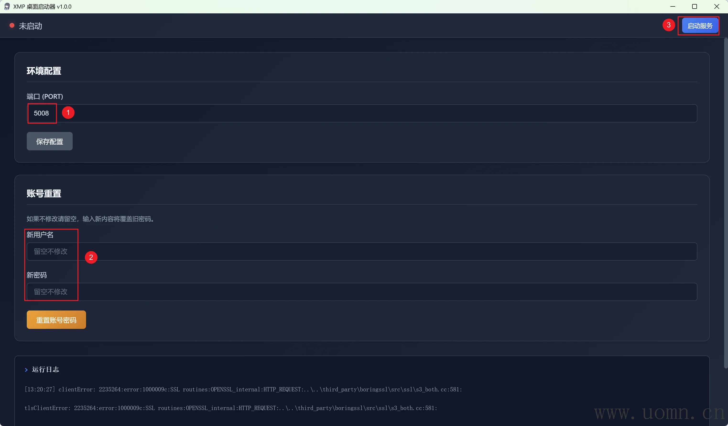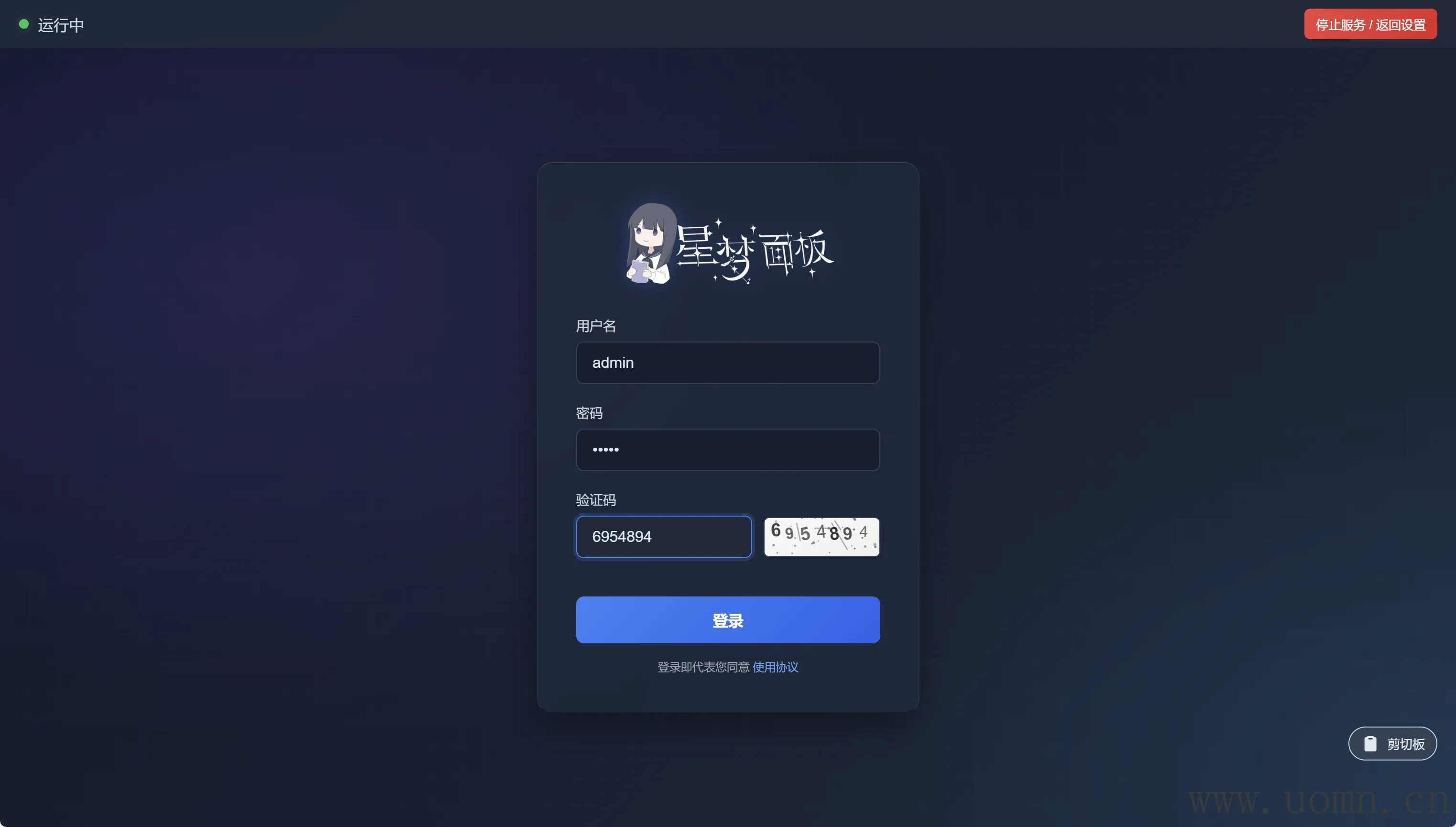 其中端口为服务运行的端口,如果不进行账号密码的重置,则默认账号密码为admin,点右上角启动服务开始使用