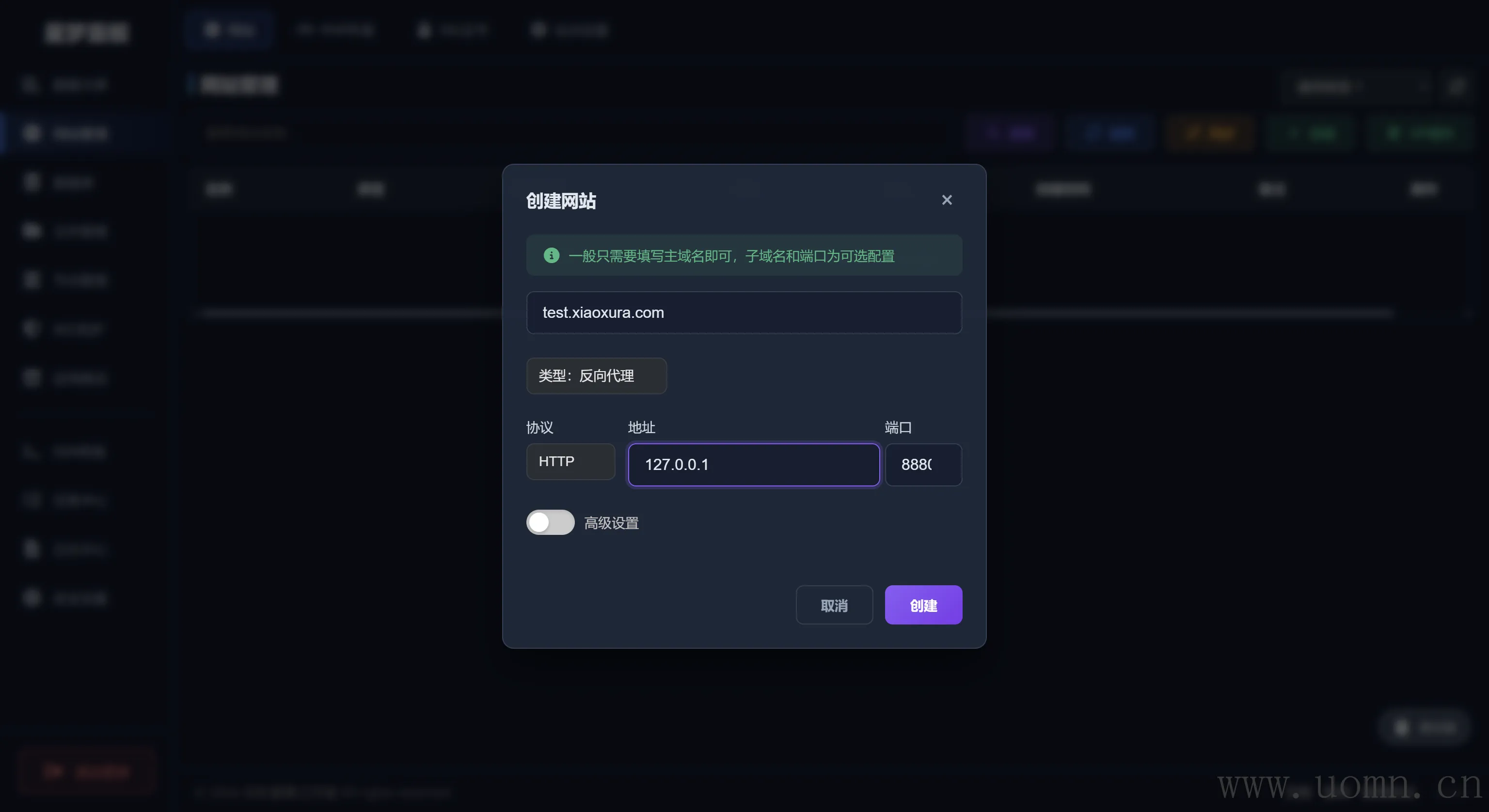 类型选择反向代理,Typecho暴露的端口是8880,所以端口填写8880。然后创建