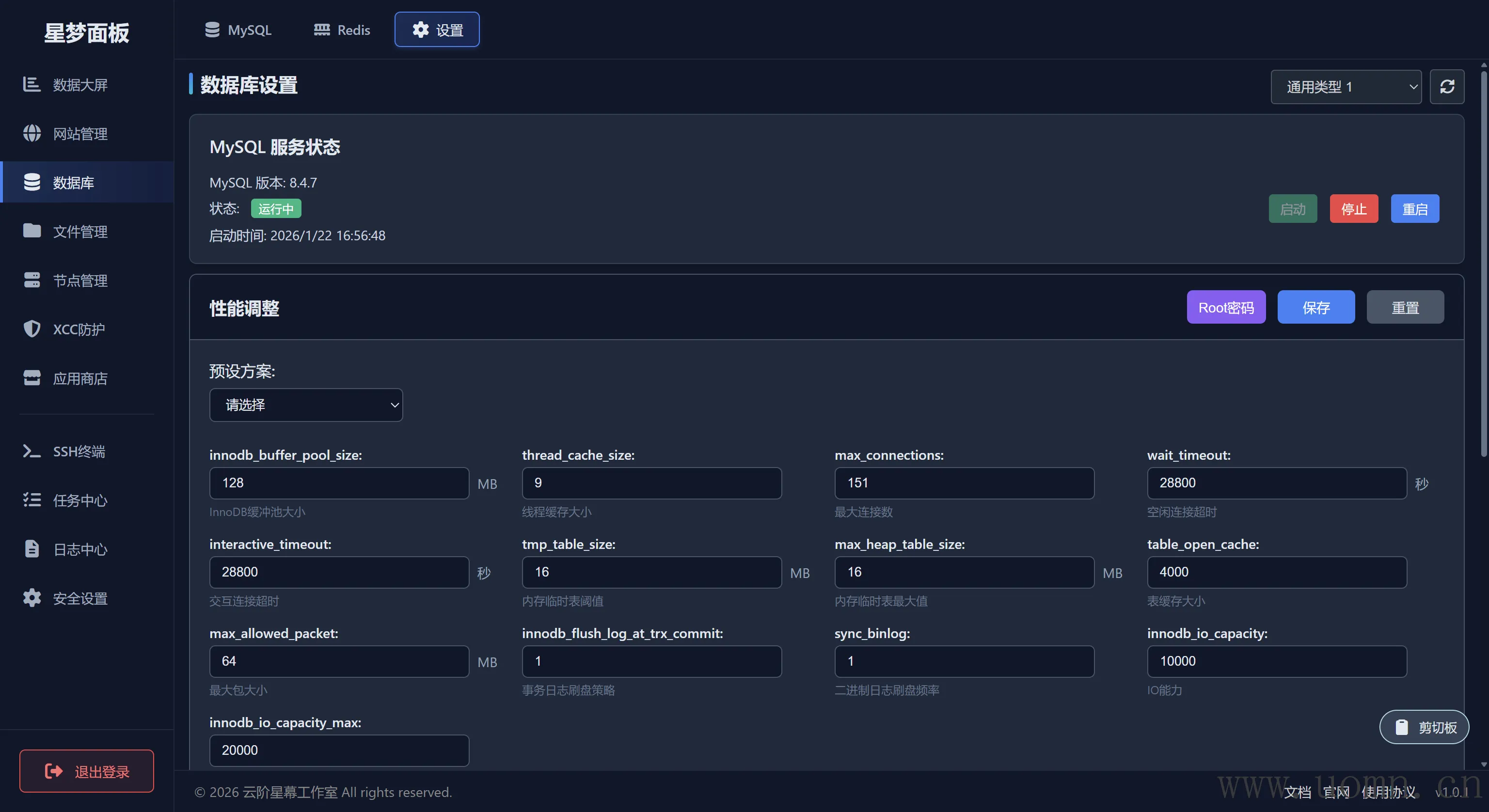 在设置页面能够调整一下MySQL的性能信息、Root密码、看看日志啥的
