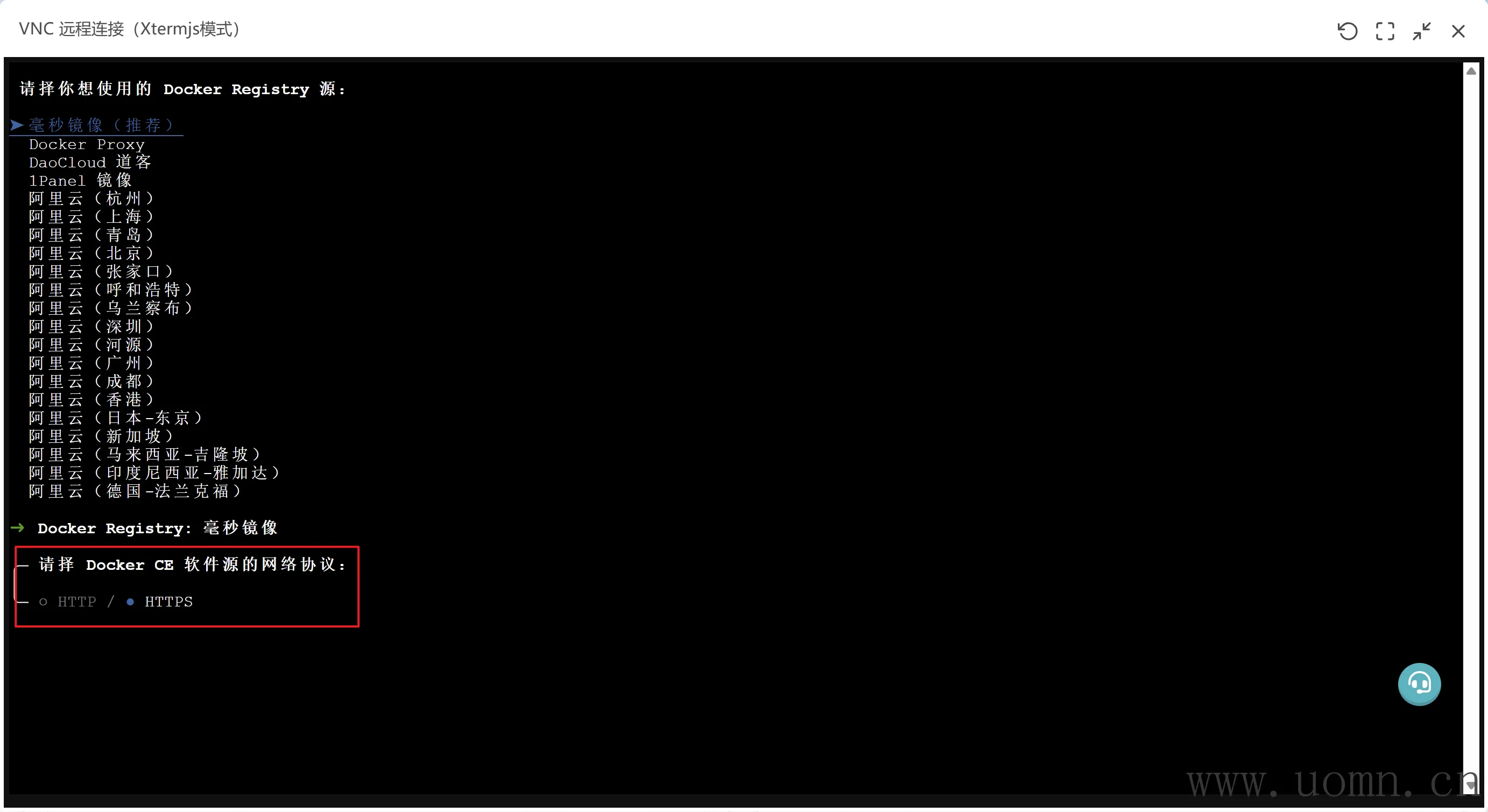 然后进入第三方Docker的安装界面,连续回车三次,进入到下方界面,按一下键盘的右键,会调整为HTTPS协议,然后接着回车,遇到需要选择的地方,也直接回车,我这里就不截图了