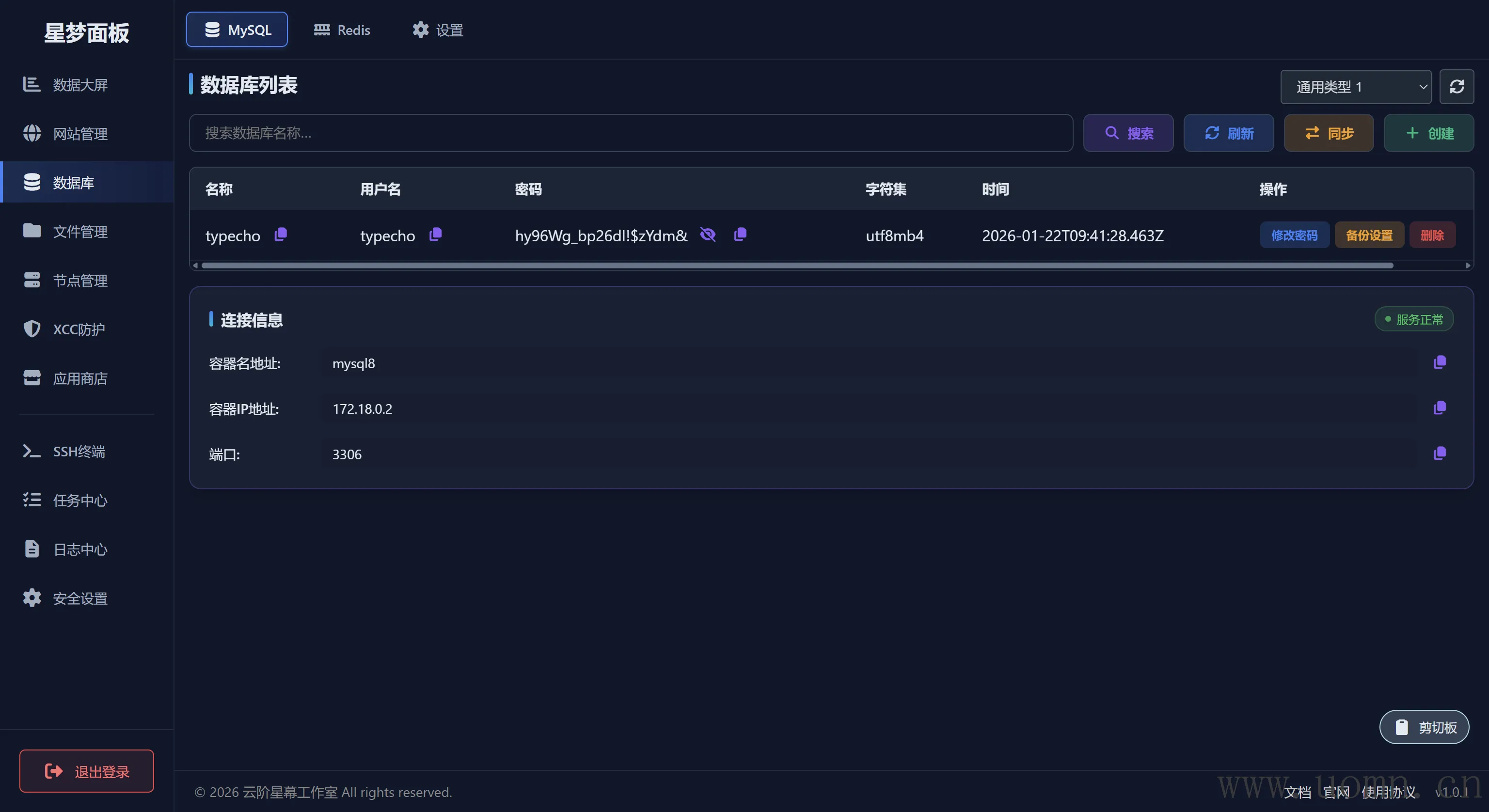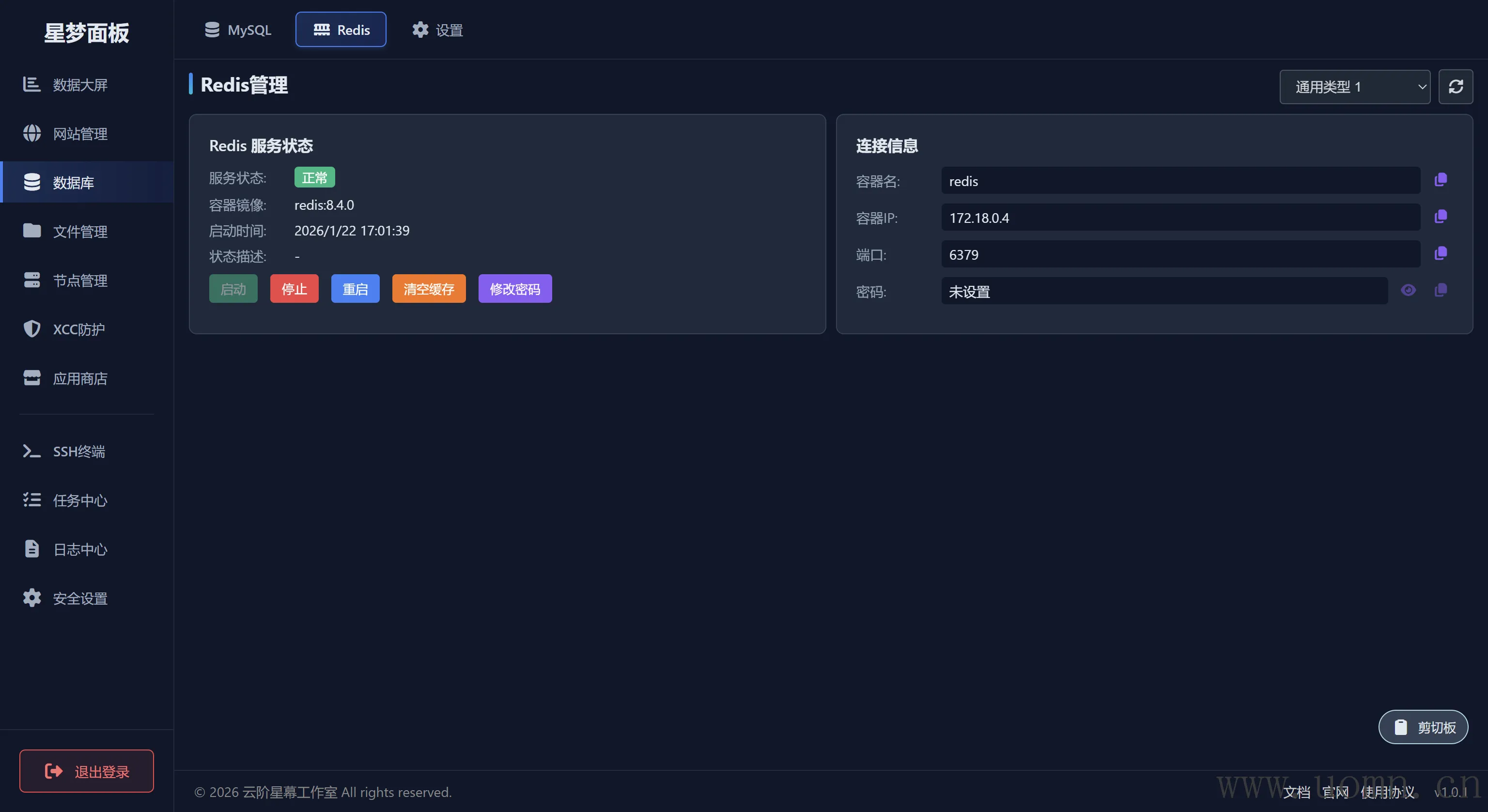 之前在应用商店安装了MySQL和Redis,在这里就可以进行管理