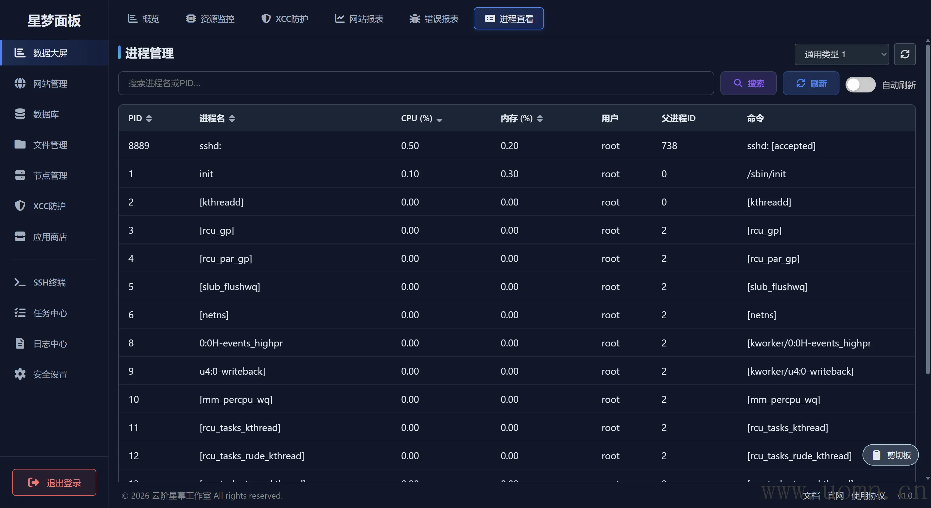 能够查看通用类型节点的服务器进程信息,由于被控不是Root权限,故未提供新增、删除进程的功能