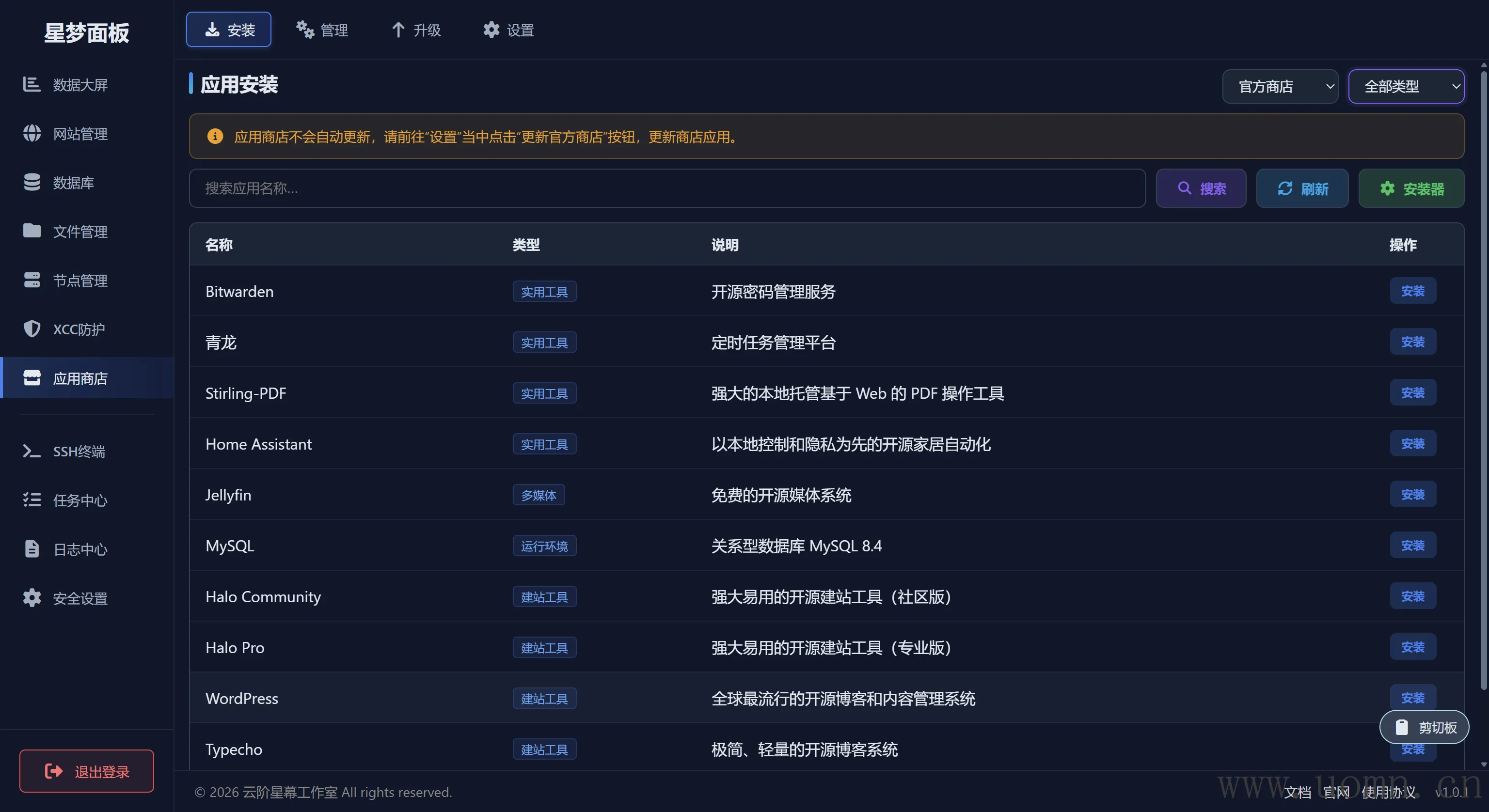 在此页面能够安装一些常用的应用,这里我把建站相关的应用都装上了